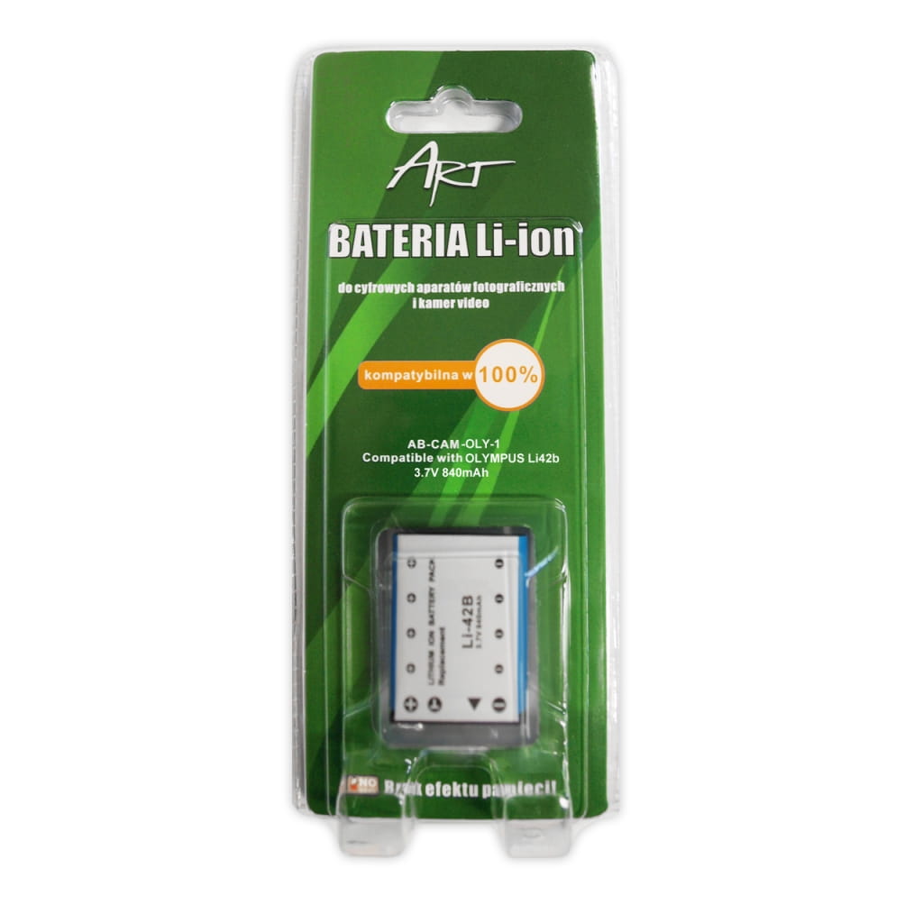 Producent: ART;Symbol producenta: AB-CAM-OLY-1;Zastępuje/ ładuje: LI-42B;Rodzaj produktu: Akumulator do aparatów fotograficznych;Typ: LI-ION;Napięcie: 3.7 V;Pojemność/Zawartość: 740 mAh;Ilość sztuk w opakowaniu: 1;Kompatybilny z : OLYMPUS;Modele: MJU 700 / 720 725 / 730 / 740 / 750, FE 160 / 190;Inne cechy: Brak efektu pamięci;Gwarancja: 24 miesiące;Znak bezpieczeństwa/zgodności: CE;Dopuszczenie do obrotu w RP: Tak;Kraj pochodzenia: Chiny;