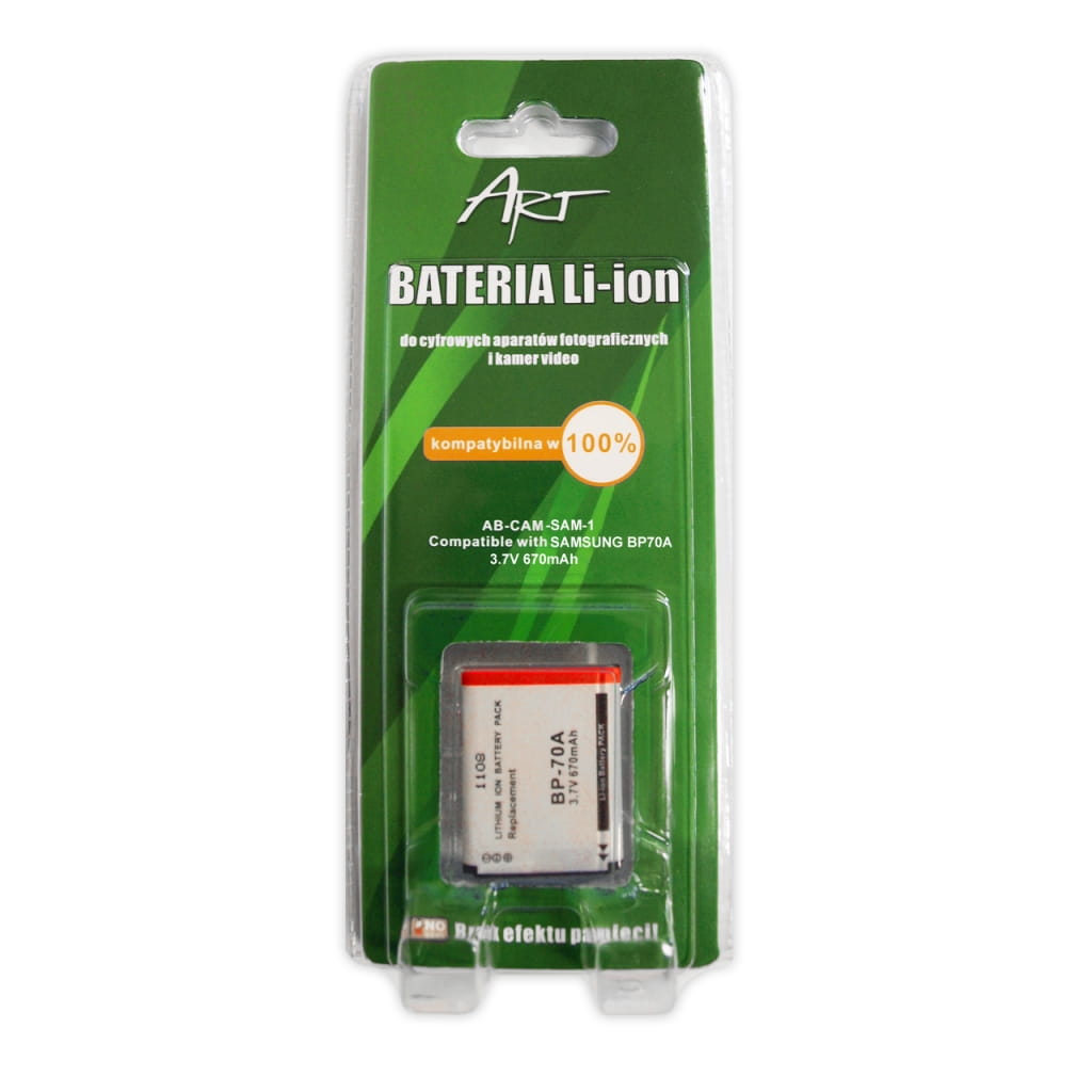 Producent: ART;Symbol producenta: AB-CAM-SAM-1;Zastępuje/ ładuje: BP70A;Rodzaj produktu: Akumulator do aparatów fotograficznych;Typ: LI-ION;Napięcie: 3.7 V;Pojemność/Zawartość: 670 mAh;Ilość sztuk w opakowaniu: 1;Kompatybilny z : SAMSUNG;Modele: Digimax ES65 / ES70 / ES75 / ES80 / PL20 / PL80 / PL90 / PL100 / PL120 / PL170 / PL200 / ST30 / ST60 / ST65 / ST70 / ST80 / ST90 / ST95 / WP10;Inne cechy: Brak efektu pamięci;Gwarancja: 24 miesiące;Znak bezpieczeństwa/zgodności: CE;Dopuszczenie do obrotu w RP: Tak;Kraj pochodzenia: Chiny;