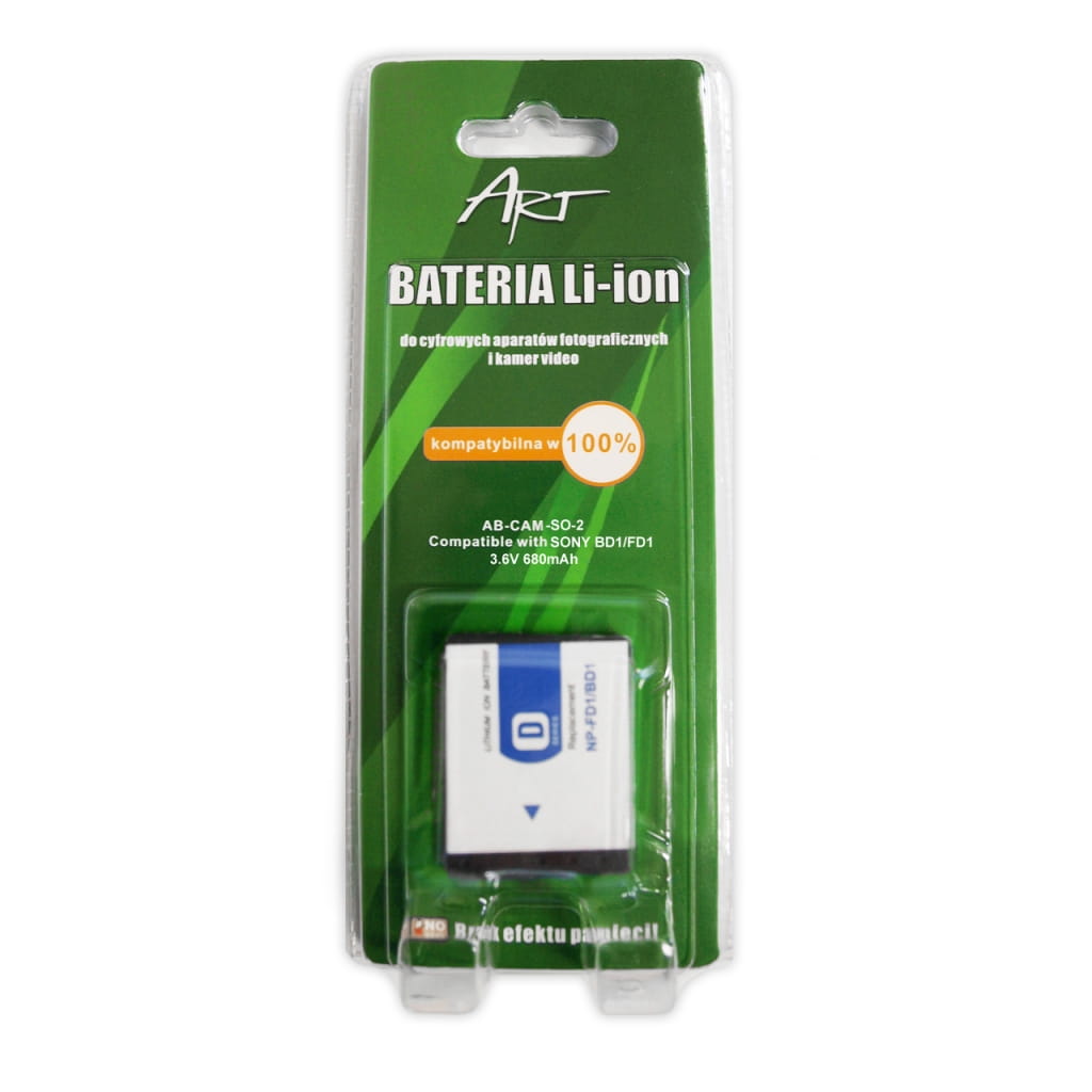 Producent: ART;Symbol producenta: AC-CAM-SO-2;Zastępuje/ ładuje: NP-BD1 / NP-FD1;Rodzaj produktu: Akumulator do aparatów fotograficznych;Typ: LI-ION;Napięcie: 3.6 V;Pojemność/Zawartość: 680 mAh;Ilość sztuk w opakowaniu: 1;Kompatybilny z : SONY;Modele: Cybershot DSC-T200 / DSC-T2 / DSC-T300 / DSC-T70 / DSC-T75 / DSC-T77 / DSC-T700 ;Inne cechy: Brak efektu pamięci;Gwarancja: 24 miesiące;Znak bezpieczeństwa/zgodności: CE;Dopuszczenie do obrotu w RP: Tak;Kraj pochodzenia: Chiny;
