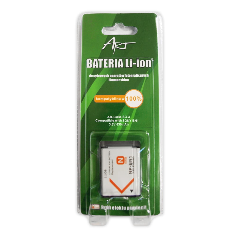 Producent: ART;Symbol producenta: AB-CAM-SO-3;Zastępuje/ ładuje: NP-BN1;Rodzaj produktu: Akumulator do aparatów fotograficznych;Typ: LI-ION;Napięcie: 3.6 V;Pojemność/Zawartość: 630 mAh;Ilość sztuk w opakowaniu: 1;Kompatybilny z : SONY;Modele: Cybershot DSC-T99 / DSC-TX10 / DSC-TX100 / DSC-W310 / DSC-W320 / DSC-W330 / DSC-W350 / DSC-W360 / DSC-W380 / DSC-W390 / DSC-W510 / DSC-W530 / DSC-W70 / DSC-WX10 / DSC-WX5 / DSC-WX7;Inne cechy: Brak efektu pamięci;Gwarancja: 24 miesiące;Znak bezpieczeństwa/zgodności: CE;Dopuszczenie do obrotu w RP: Tak;Kraj pochodzenia: Chiny;