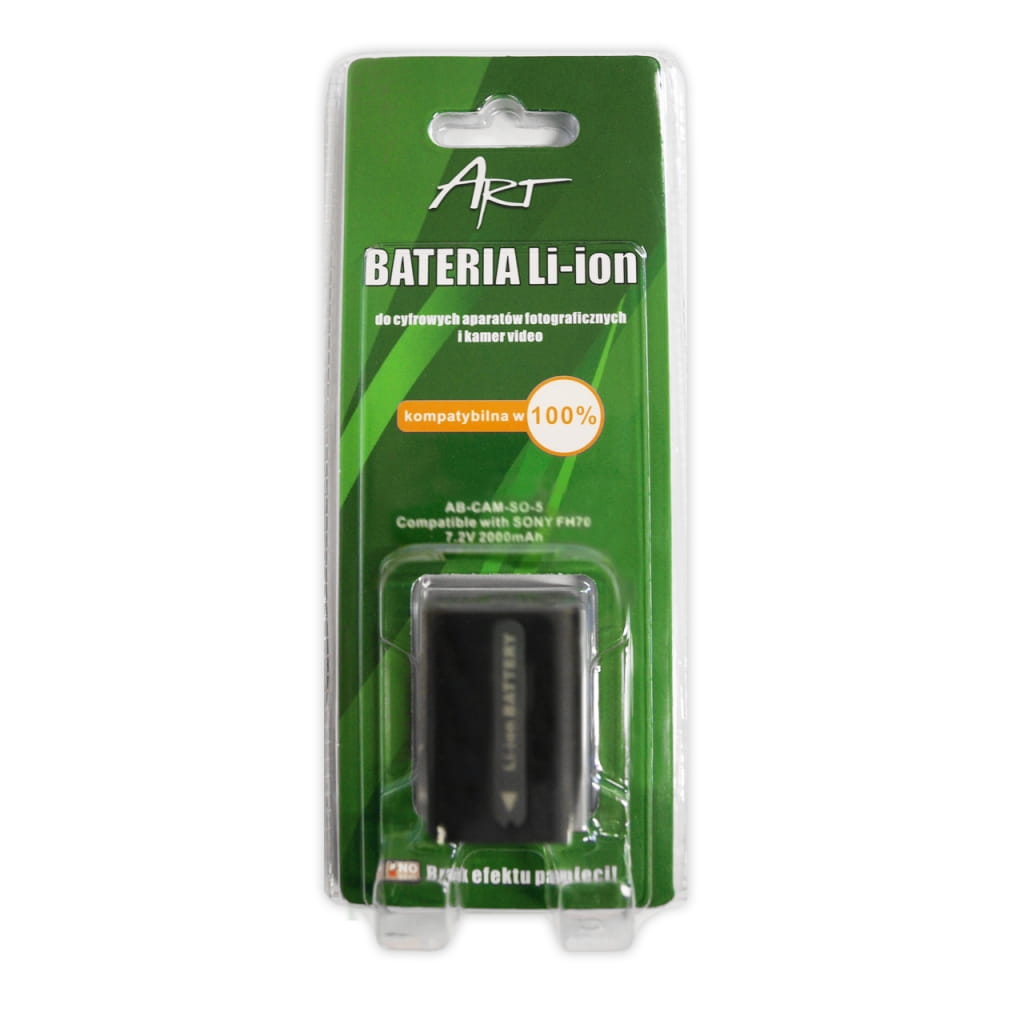 Producent: ART;Symbol producenta: AB-CAM-SO-5;Zastępuje/ ładuje: NP-FH70;Rodzaj produktu: Akumulator do kamer video;Typ: LI-ION;Napięcie: 7.2 V;Pojemność/Zawartość: 1800 mAh;Ilość sztuk w opakowaniu: 1;Kompatybilny z : SONY;Modele: HDR-SR10E / HDR-SR11E / HDR-SR12E / HDR-CX11E / HDR-CX6EK / HDR-UX9E / HDR-UX19E / HDR-HC9E / DCR-SR35E / DCR-SR36E / DCR-SR55E / DCR-SR75E / DCR-SR210E / DCR-DVD110E / DCR-DVD115E / DCR-DVD310E / DCR-DVD410E / DCR-DVD510E / DCR-HC51E / DCR-HC53E;Inne cechy: Brak efektu pamięci;Gwarancja: 24 miesiące;Znak bezpieczeństwa/zgodności: CE;Dopuszczenie do obrotu w RP: Tak;Kraj pochodzenia: Chiny;