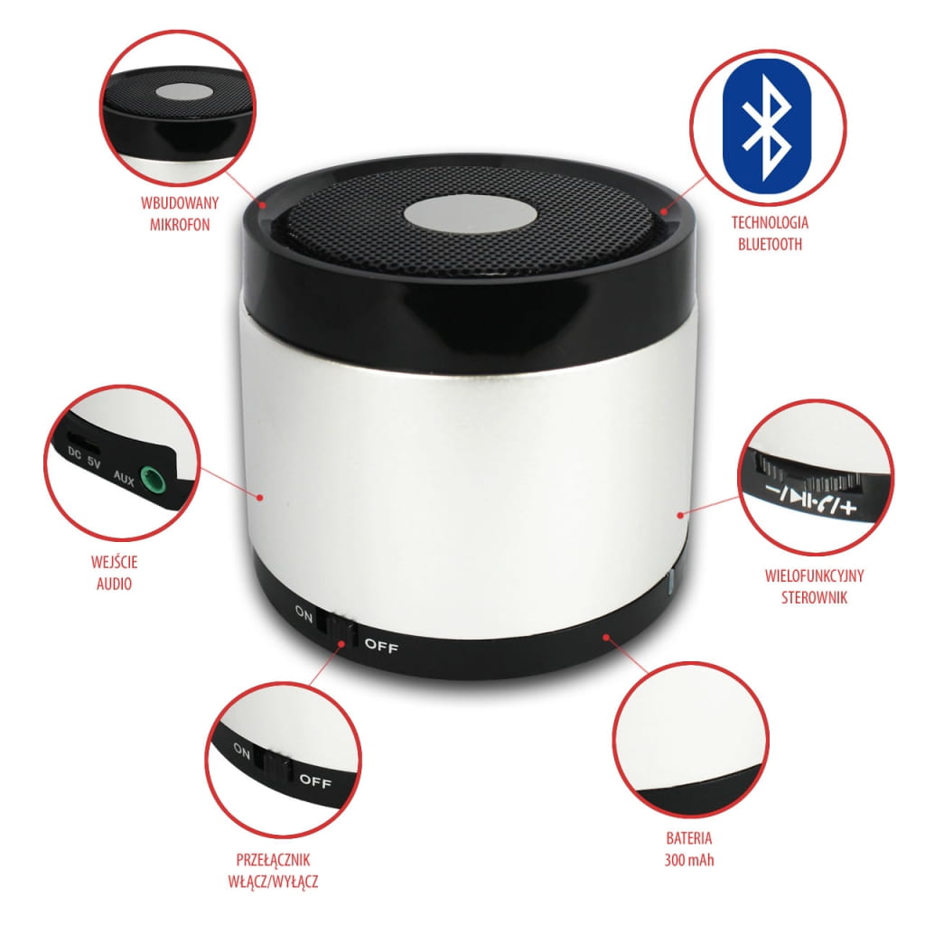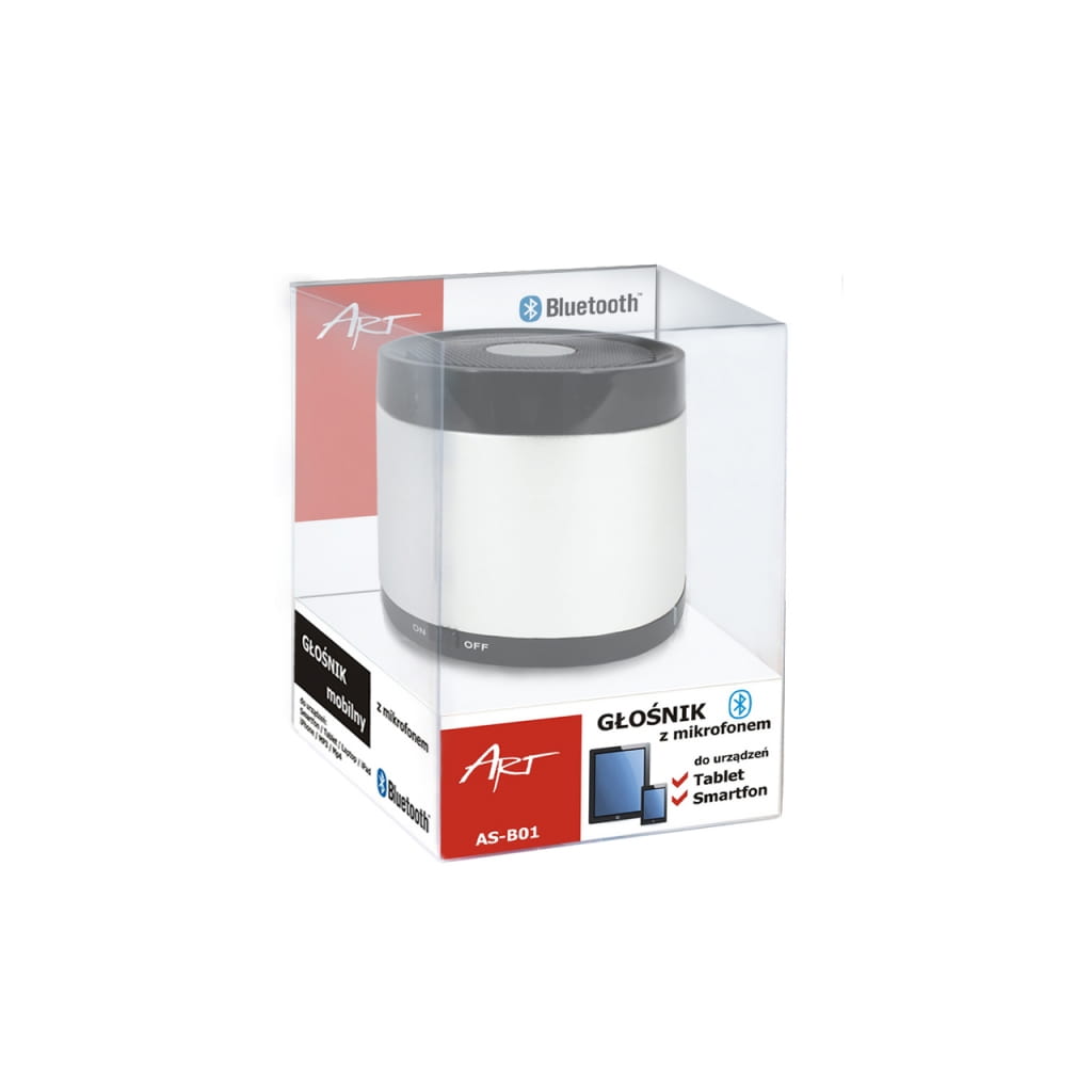 Producent: ART;Symbol producenta: AS-B01;Rodzaj urządzenia: Głośniki BLUETOOTH;Moc R.M.S.: 3 W;Pasmo przenoszenia: 90Hz-20KHz;Czułość: 80 dB;Wyjście słuchawkowe: Nie;Wejście audio: Tak;Zasilanie: Bateria;Inne cechy: Dzięki wbudowanemu mikrofonowi, możliwość prowadzenia rozmów telefonicznych;Gwarancja: 24 miesiące;Znak bezpieczeństwa/zgodności: CE;Dopuszczenie do obrotu w RP: Tak;Kraj pochodzenia: Chiny;