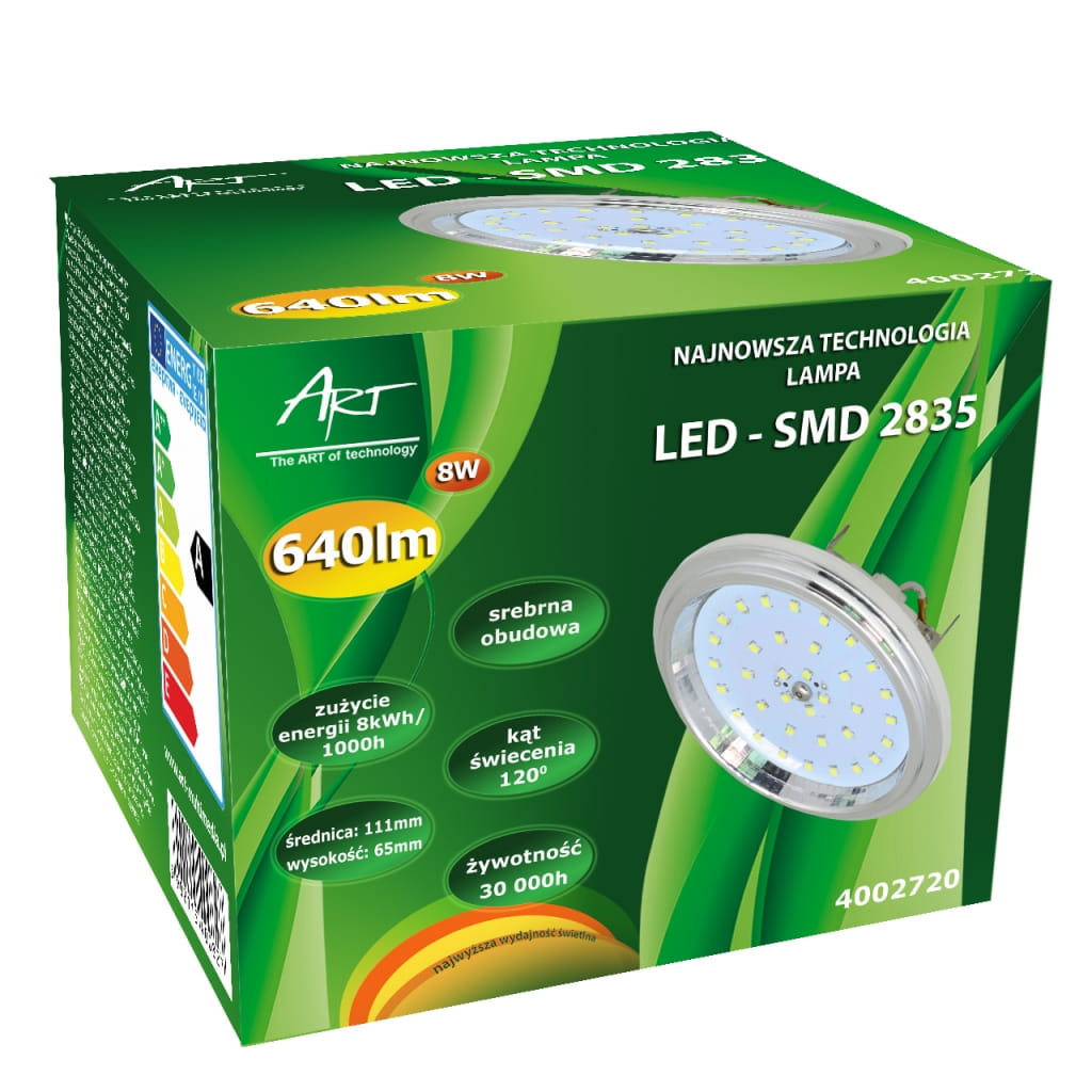 Producent: ART;Symbol producenta: 4002720;Rodzaj produktu: Żarówka LED;Moc: 8W;Mocowanie: G53;Ilość diod LED: 33;Rodzaj LED: SMD 2835;Napięcie: AC/DC 12V;Barwa światła (K): 3000 (ciepło-biała);Moc strumienia świetlnego (lm): 640;Kąt świecenia (st): 120;Szerokość : 111 mm;Wysokość : 65 mm;Inne cechy: Srebrna obudowa;Gwarancja: 24 miesiące;Zużycie energii: 8kWh/1000h;Klasa energetyczna: A;Liczba cykli włącz/wyłącz: >15 000;Czas nagrzewania: <1s;Trwałość: 30 000h;CRI/Ra: >80;Czas zapłonu: <1s;Współczynnik mocy: 0,6;LLMF: 0,65;Przeznaczenie do ściemniania: Nie;Przeznacznie do oświetlenia akcentowego: Nie;Znak bezpieczeństwa/zgodności: CE;Dopuszczenie do obrotu w RP: Tak;Kraj pochodzenia: Chiny;