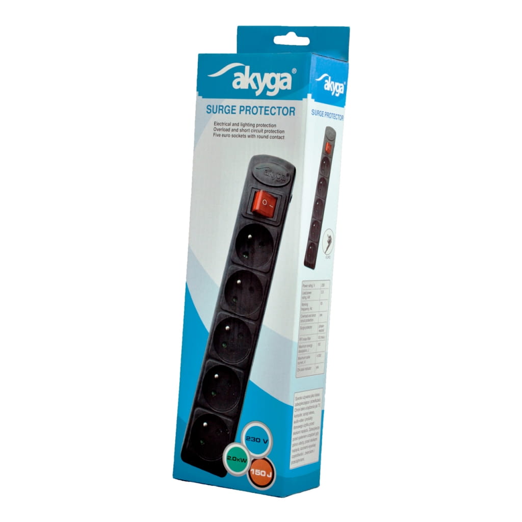 Producent: AKYGA;Symbol producenta: AK-SP05A;Rodzaj produktu: Listwa zasilająca;Ilość gniazdek: 5;Długość kabla zasilającego: 1,8 m;Zabezpieczenie przeciwprzepięciowe: Tak;Filtr przeciwzakłóceniowy: Tak;Inne cechy: Posiada: uziemienie, bezpiecznik, wyłącznik, zabezpieczenie przeciwzwarciowe. Zgodność z normami CE;Gwarancja: 24 miesiące;Znak bezpieczeństwa/zgodności: CE;Dopuszczenie do obrotu w RP: Tak;Kraj pochodzenia: Chiny;