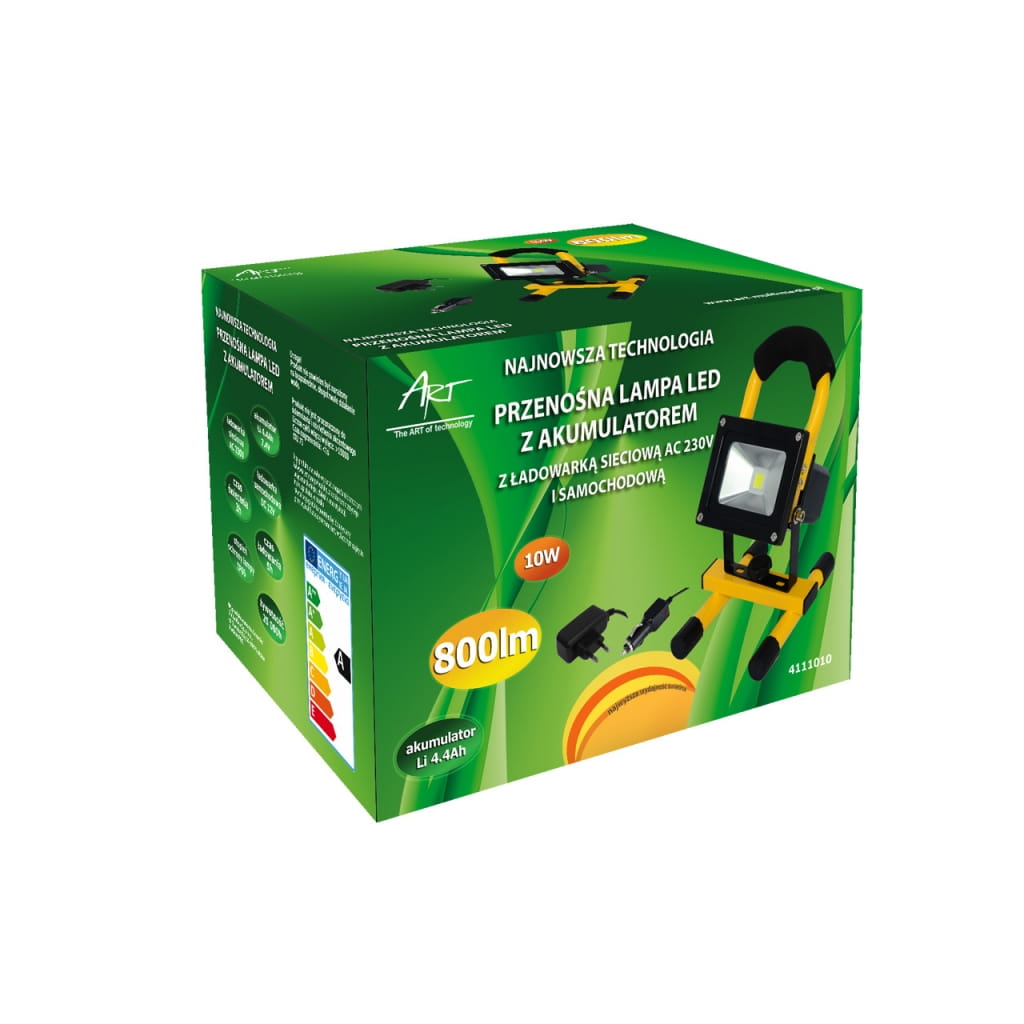 Producent: ART;Symbol producenta: 4111010;Rodzaj produktu: Lampa LED;Moc: 10W;Ilość diod LED: 1;Materiał wykonania: Metal;Wodoodporność: tak;Rodzaj LED: COB;Napięcie: AC 230V / DC 12V;Barwa światła: Biała;Barwa światła (K): 4000;Moc strumienia świetlnego (lm): 800;Kąt świecenia (st): 120;Inne cechy: akumulator 4.4Ah, czas świecenia 3h;Wymiary opakowania (mm): 225 x 165 x 152;Gwarancja: 24 miesiące;Zużycie energii: 10kWh/1000h;Klasa energetyczna: A;Liczba cykli włącz/wyłącz: >15 000;Czas nagrzewania: <1s;Trwałość: 30 000h;CRI/Ra: >75;Czas zapłonu: <1s;Współczynnik mocy: 0,6;LLMF: 0,65;Przeznaczenie do ściemniania: Nie;Przeznacznie do oświetlenia akcentowego: Nie;Znak bezpieczeństwa/zgodności: CE;Dopuszczenie do obrotu w RP: Tak;Kraj pochodzenia: Chiny;