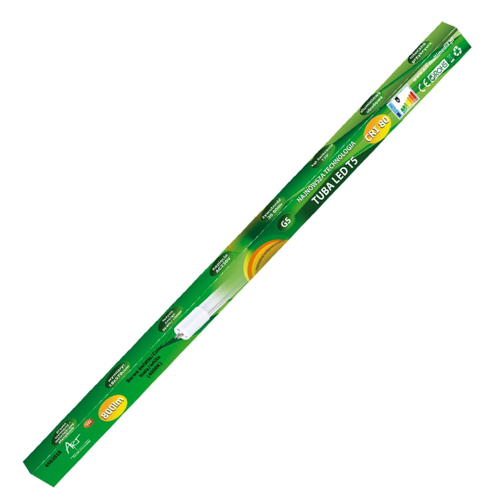 Producent: ART;Symbol producenta: 4502010;Rodzaj produktu: Tuba LED T5;Moc: 9W;Wodoodporność: Nie;Napięcie: AC 230V;Barwa światła: Biała;Barwa światła (K): 4000;Moc strumienia świetlnego (lm): 800;Kąt świecenia (st): 120;Długość lampy (mm): 570;Średnica lampy (mm): 18;Inne cechy: Prosta wymiana - wewnętrzny sterownik;Wymiary opakowania (mm): 600 x 23 x 23;Gwarancja: 24 miesiące;Zużycie energii: 9kWh/1000h;Klasa energetyczna: A+;Liczba cykli włącz/wyłącz: >15 000;Czas nagrzewania: <1s;Trwałość: 30 000h;CRI/Ra: >80;Czas zapłonu: <1s;Współczynnik mocy: 0,6;LLMF: 0,65;Przeznaczenie do ściemniania: Nie;Przeznacznie do oświetlenia akcentowego: Nie;Znak bezpieczeństwa/zgodności: CE;Dopuszczenie do obrotu w RP: Tak;Kraj pochodzenia: Chiny;