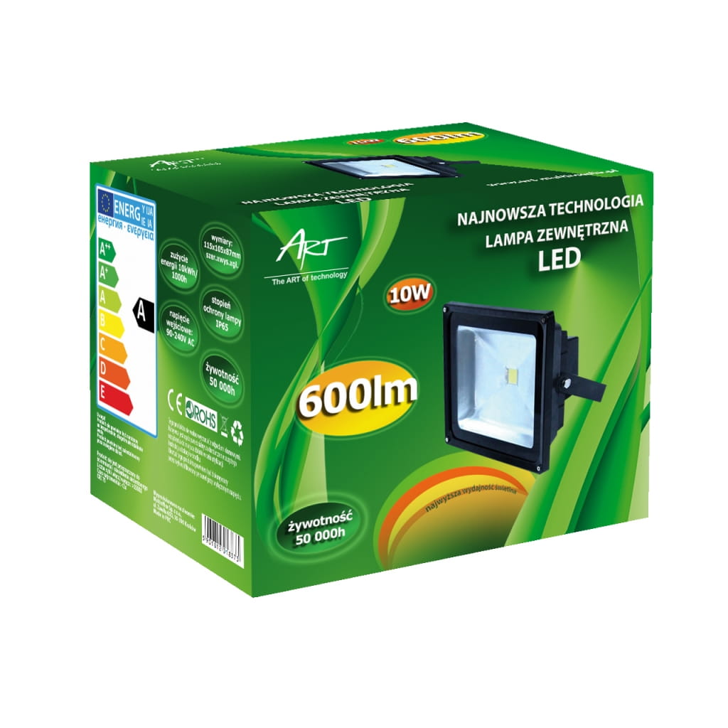 Producent: ART;Symbol producenta: 4102030 EKO;Rodzaj produktu: Lampa LED;Moc: 10W;Wodoodporność: TAK;Rodzaj LED: COB;Napięcie: AC 80-265V;Barwa światła: Zimno-biała;Barwa światła (K): 6500;Moc strumienia świetlnego (lm): 600;Kąt świecenia (st): 120;Szerokość lampy (mm): 115;Wysokość lampy (mm): 85;Głębokość lampy (mm): 100;Inne cechy: Stopień ochrony IP65;Wymiary opakowania (mm): 120 x 90 x 93;Gwarancja: 24 miesiące;Zużycie energii: 10kWh/1000h;Klasa energetyczna: A;Liczba cykli włącz/wyłącz: >15 000;Czas nagrzewania: <1s;Trwałość: 50 000h;CRI/Ra: >75;Czas zapłonu: <1s;Współczynnik mocy: 0,6;LLMF: 0,65;Przeznaczenie do ściemniania: Nie;Przeznacznie do oświetlenia akcentowego: Nie;Znak bezpieczeństwa/zgodności: CE;Dopuszczenie do obrotu w RP: Tak;Kraj pochodzenia: Chiny;