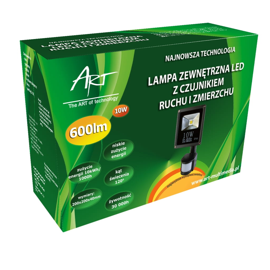 Producent: ART;Symbol producenta: 4102325;Rodzaj produktu: Lampa LED z czujnikiem ruchu i zmierzchu;Moc: 10W;Wodoodporność: TAK;Rodzaj LED: COB;Napięcie: AC 90-240V;Barwa światła: Biała;Barwa światła (K): 4000;Moc strumienia świetlnego (lm): 600;Kąt świecenia (st): 120;Szerokość lampy (mm): 195;Wysokość lampy (mm): 123;Głębokość lampy (mm): 80;Inne cechy: IP66 dla Lampy, IP44 dla czujnika;Wymiary opakowania (mm): 200 x 90 x 130;Gwarancja: 24 miesiące;Zużycie energii: 10kWh/1000h;Klasa energetyczna: A;Liczba cykli włącz/wyłącz: >15 000;Czas nagrzewania: <1s;Trwałość: 30 000h;CRI/Ra: >75;Czas zapłonu: <1s;Współczynnik mocy: 0,6;LLMF: 0,65;Przeznaczenie do ściemniania: Nie;Przeznacznie do oświetlenia akcentowego: Nie;Znak bezpieczeństwa/zgodności: CE;Dopuszczenie do obrotu w RP: Tak;Kraj pochodzenia: Chiny;