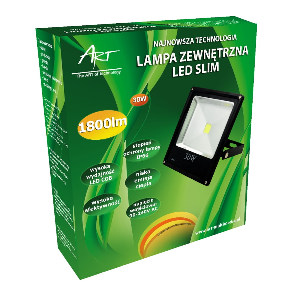 Producent: ART;Symbol producenta: 4102370;Rodzaj produktu: Lampa LED;Moc: 30W;Wodoodporność: TAK;Rodzaj LED: COB;Napięcie: AC 90-240V;Barwa światła: Ciepło-biała;Barwa światła (K): 3000;Moc strumienia świetlnego (lm): 1800;Kąt świecenia (st): 120;Szerokość lampy (mm): 260;Wysokość lampy (mm): 228;Głębokość lampy (mm): 70;Inne cechy: Stopień ochrony IP66;Wymiary opakowania (mm): 240 x 70 x 270;Gwarancja: 24 miesiące;Zużycie energii: 30kWh/1000h;Klasa energetyczna: A;Liczba cykli włącz/wyłącz: >15 000;Czas nagrzewania: <1s;Trwałość: 30 000h;CRI/Ra: >75;Czas zapłonu: <1s;Współczynnik mocy: 0,6;LLMF: 0,65;Przeznaczenie do ściemniania: Nie;Przeznacznie do oświetlenia akcentowego: Nie;Znak bezpieczeństwa/zgodności: CE;Dopuszczenie do obrotu w RP: Tak;Kraj pochodzenia: Chiny;
