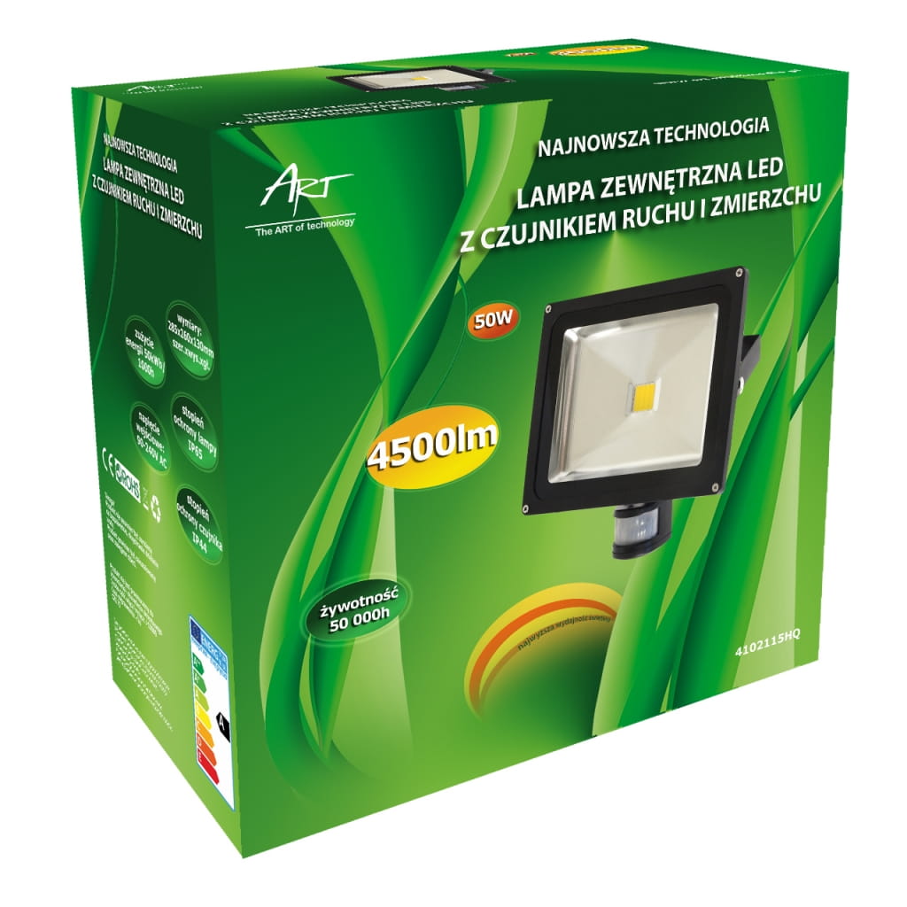 Producent: ART;Symbol producenta: 4102115 HQ;Rodzaj produktu: Lampa LED z czujnikiem ruchu i zmierzchu;Moc: 50W;Wodoodporność: TAK;Rodzaj LED: COB;Napięcie: AC 80-265V;Barwa światła (K): 4000;Moc strumienia świetlnego (lm): 4500;Kąt świecenia (st): 120;Inne cechy: IP65 dla Lampy, IP44 dla czujnika;Wymiary opakowania (mm): 295 x 160 x 280;Gwarancja: 24 miesiące;Zużycie energii: 50kWh/1000h;Klasa energetyczna: A;Liczba cykli włącz/wyłącz: >15 000;Czas nagrzewania: <1s;Trwałość: 30 000h;CRI/Ra: >75;Czas zapłonu: <1s;Współczynnik mocy: 0,6;LLMF: 0,65;Przeznaczenie do ściemniania: Nie;Przeznacznie do oświetlenia akcentowego: Nie;Znak bezpieczeństwa/zgodności: CE;Dopuszczenie do obrotu w RP: Tak;Kraj pochodzenia: Chiny;