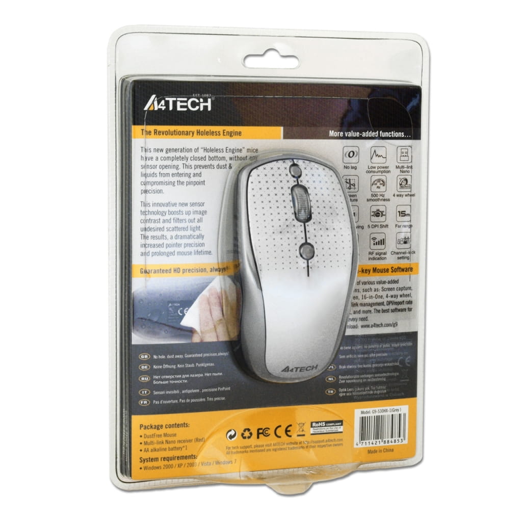 Producent: A4Tech;Symbol producenta: G9-530HX;Transmisja: Bezprzewodowa;Technologia: Holeless Engine;Częstotliwość: 2,4GHz;Zasięg: 15 m;Port: USB ;Rozdzielczość: 800/1000/1200/1600/2000 DPI;Wielkość: Standardowa;Kolor: Stalowy;Ilość przycisków: 5;Ilość rolek: 1;Przycisk zmiany rozdzielczości: Tak;Przycisk "podwójnego kliknięcia" : Tak;Inne cechy: Mysz bez otworu czujnika (zamkniete dno myszy). Natężenie światła - max 54400Lux;Kompatybilna z: Windows 2000/2003/XP/Vista/7. Oprogramowanie: 8-in-One;Gwarancja: 24 miesiące;Znak bezpieczeństwa/zgodności: CE;Dopuszczenie do obrotu w RP: Tak;Kraj pochodzenia: Chiny;