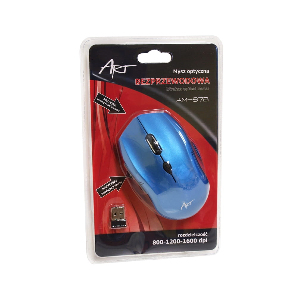 Producent: ART;Symbol producenta: AM-87B;Transmisja: Bezprzewodowa;Technologia: Optyczna;Częstotliwość: 2,4 GHz;Ilość kanałów: 16;Zasięg: 10 m;Port: USB;Rozdzielczość: 800/1200/1600 DPI;Wielkość: Standardowa;Kolor: Niebieski;Ilość przycisków: 6;Ilość rolek: 1;Przycisk pod rolką: Tak;Przycisk zmiany rozdzielczości: Tak;Antypoślizgowa powłoka: Tak;Inne cechy: Idealna do notebooka/PC.Odbionik typu nano .;Kompatybilna z: Windows 98/ME/2000/XP/Vista/7/8;Gwarancja: 24 miesiące;Znak bezpieczeństwa/zgodności: CE;Dopuszczenie do obrotu w RP: Tak;Kraj pochodzenia: Chiny;