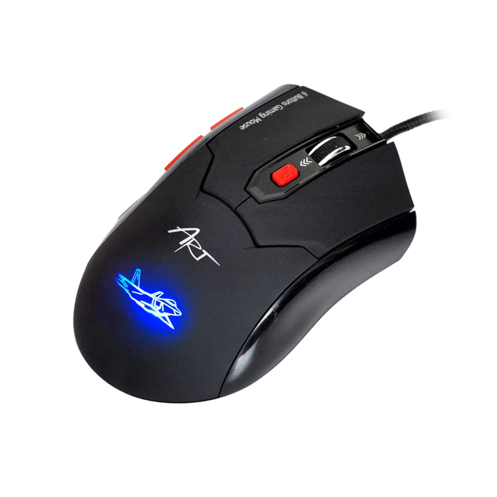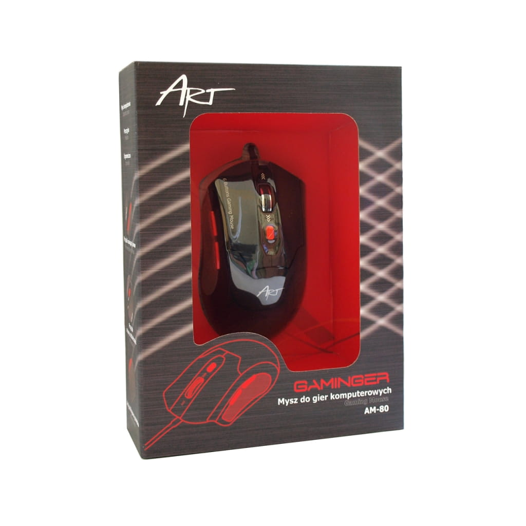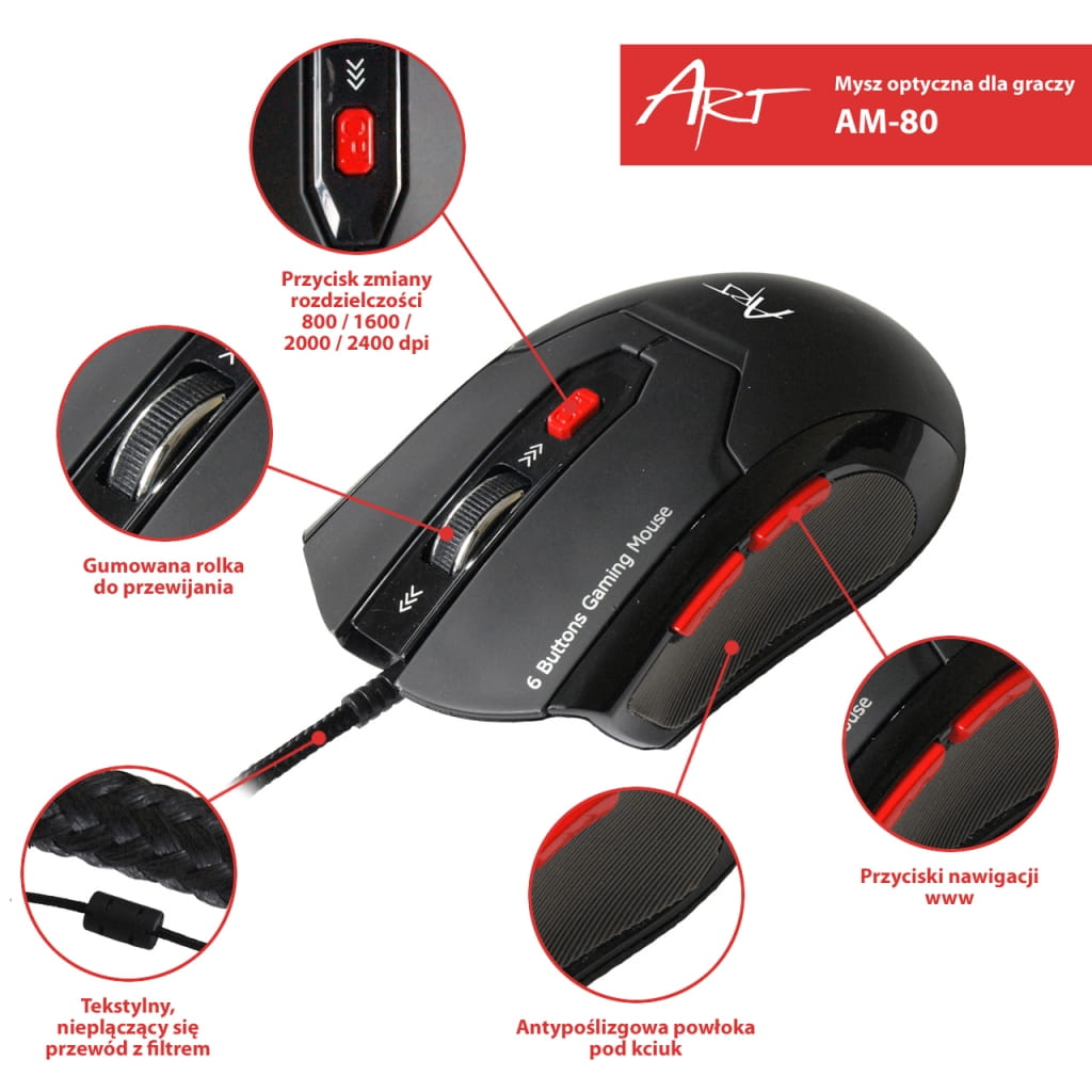 Producent: ART;Symbol producenta: AM-80;Transmisja: Przewodowa;Technologia: Optyczna;Port: USB;Rozdzielczość: Regulowana 800-1600-2000-2400 dpi;Wielkość: Standardowa;Kolor: Czarny;Ilość przycisków: 6;Ilość rolek: 1;Przycisk pod rolką: Tak;Podświetlana rolka: Tak;Przycisk zmiany rozdzielczości: Tak;Przycisk "podwójnego kliknięcia" : Nie;Antypoślizgowa powłoka: Tak;Zwijany przewód: Nie;Inne cechy: Precyzja i jakość - idealna dla graczy i nie tylko;Gwarancja: 24 miesiące;Znak bezpieczeństwa/zgodności: CE;Dopuszczenie do obrotu w RP: Tak;Kraj pochodzenia: Chiny;