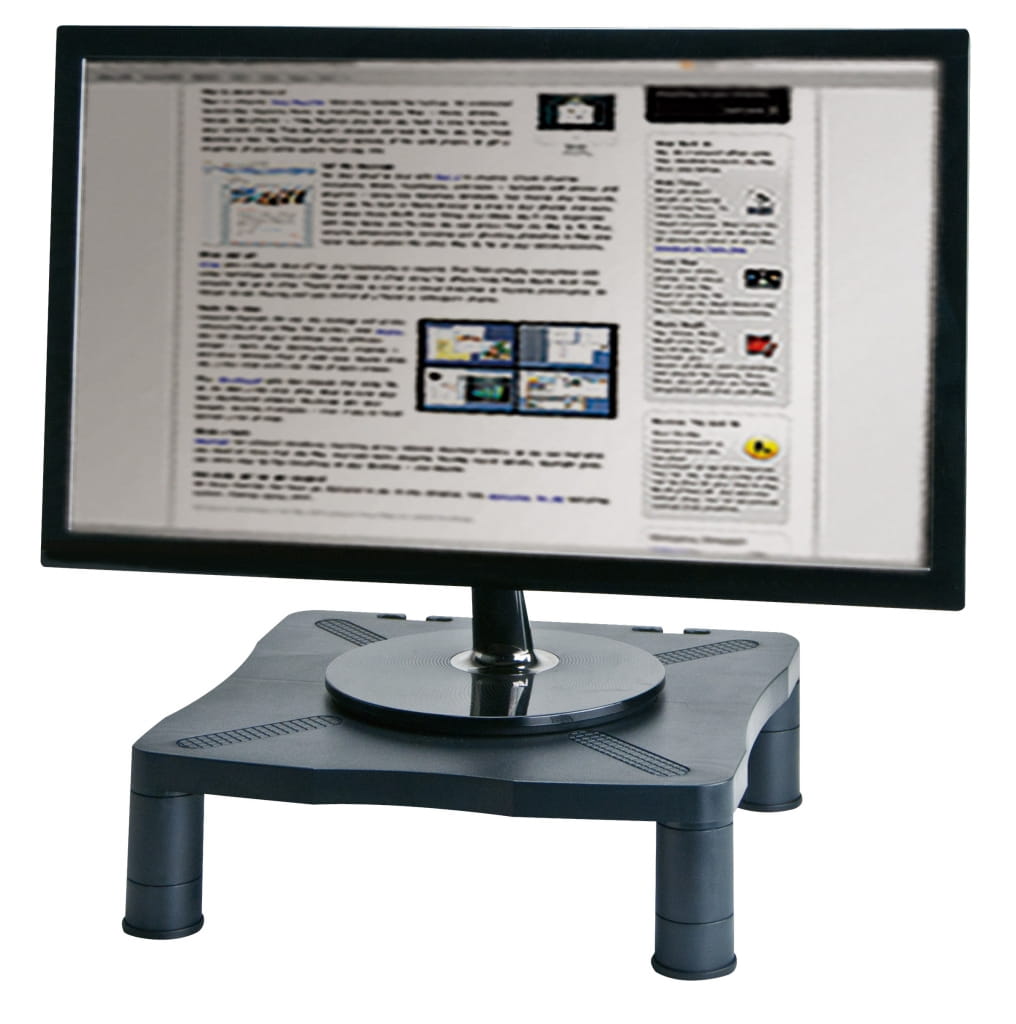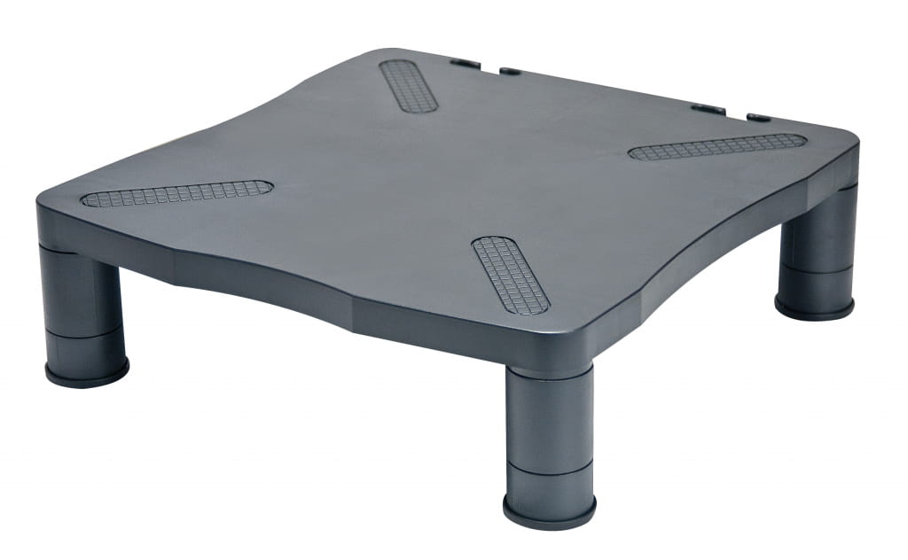 Mocna budowa umożliwiająca stabilne utrzymanie monitorów do 24 cali. Gumowe końcówki platformy zapewniają antypoślizgowe położenie platformy. Możliwość ułożenia kabla dzięki specjalnym otworom w tylnej części platformy.