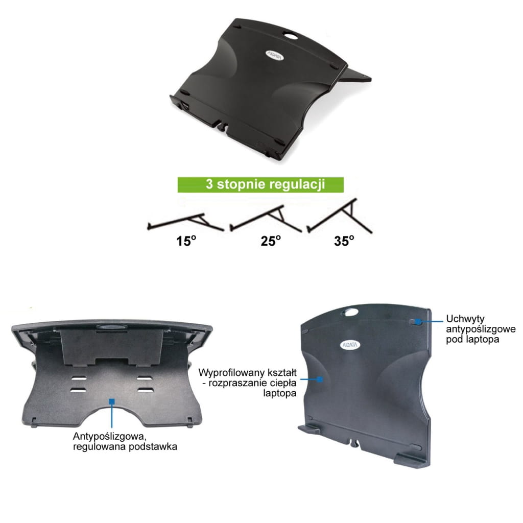 Producent: AIDATA;Symbol producenta: NS006;Rodzaj produktu: Podstawka pod notebooka;Inne cechy: Funkcjonalna i wygodna w użyciu. Regulowana podstawa o kącie nachylenia 15/25/35 stopni;Gwarancja: 24 miesiące;Dopuszczenie do obrotu w RP: Tak;Kraj pochodzenia: Tajwan;