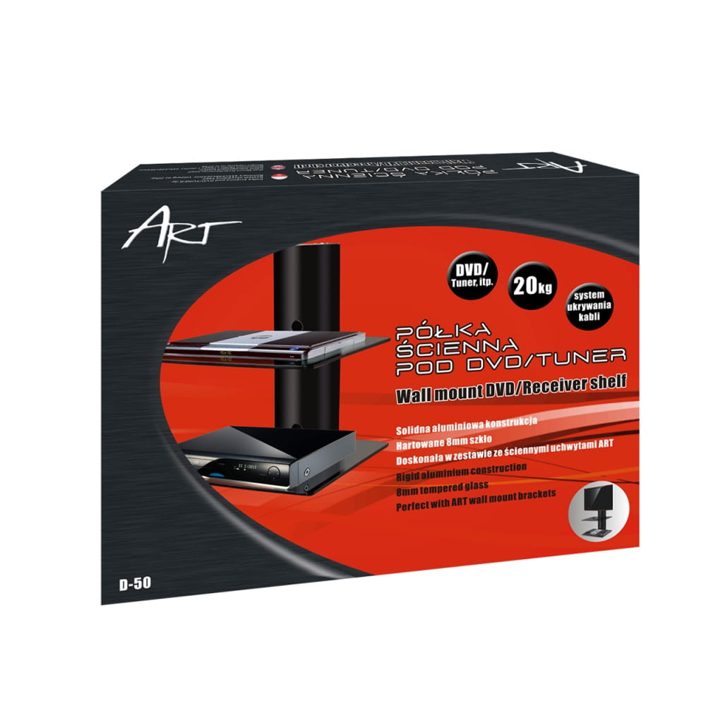 Producent: ART;Symbol producenta: D-50;Rodzaj produktu: Półka pod DVD/Tuner;Przeznaczenie: Półka pod DVD/Tuner itp do montażu na ścianie;Maksymalne obciążenie półki: 20 kg (2 x 10 kg);Wymiary (WxGxSZ): 535 x 355 x 445 mm;Materiał wykonania : Szyby: hartowane szkło, nogi: aluminium;System ukrywania kabli: Tak;Sposób lakierowania: Proszkowo;Inne cechy: Wideo prezentacja (skopiuj link do przeglądarki): http://www.youtube.com/watch?v=S2LIuRK5Tcs±list=UUmrfsiESTVdPpFUdTQE9ogQ±feature=c4-overview;Gwarancja: 24 miesiące;Dopuszczenie do obrotu w RP: Tak;Kraj pochodzenia: Chiny;