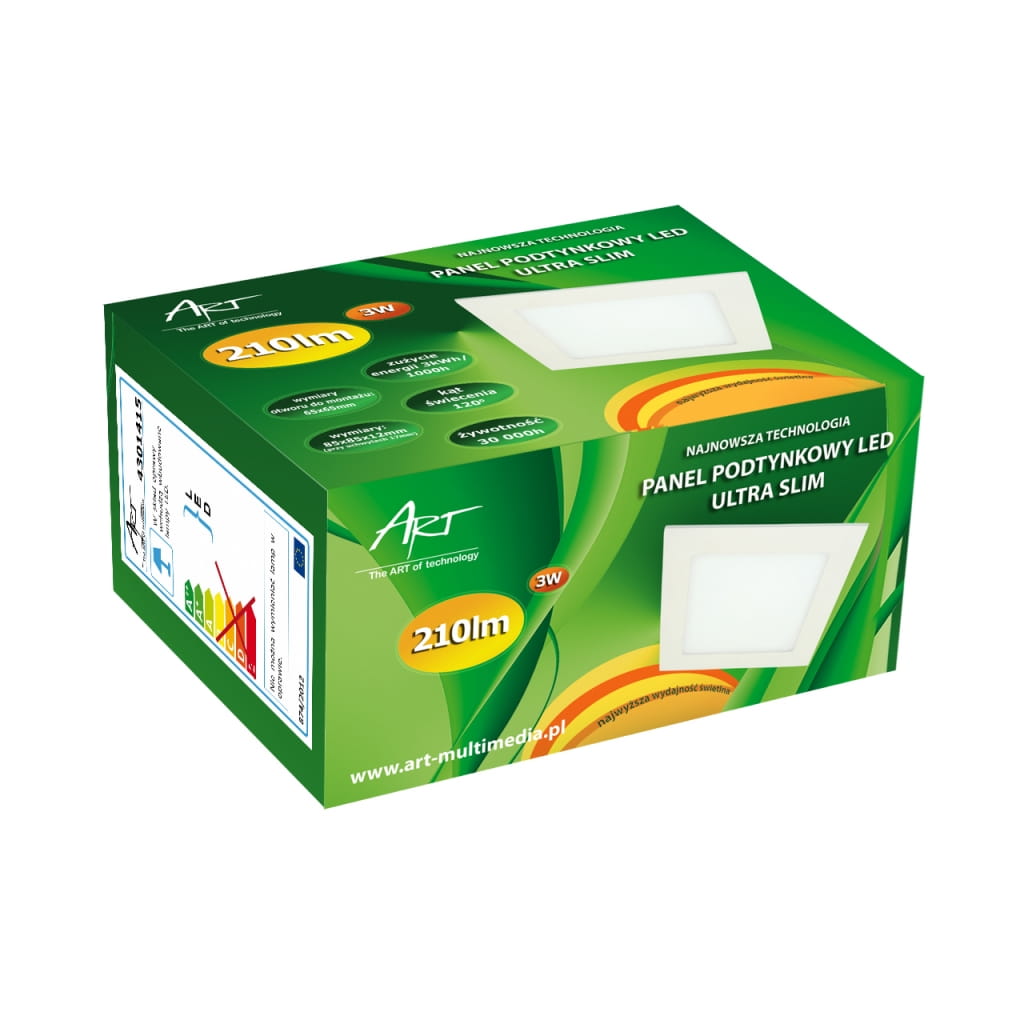 Producent: ART;Symbol producenta: 4301415;Rodzaj produktu: Panel LED ULTRA SLIM podtynkowy;Moc: 3W;Wodoodporność: Nie;Napięcie: AC 85-265V;Barwa światła: Biała;Barwa światła (K): 4000;Moc strumienia świetlnego (lm): 210;Kąt świecenia (st): 120;Zastosowanie w instalacjach: Wewnętrznych;Długość lampy (mm): 85;Szerokość lampy (mm): 85;Wysokość lampy (mm): 12 (przy uchwytach 17);Inne cechy: Wymiary otworu do montażu: 65x65mm;Wymiary opakowania (mm): 115 x 90 x 60;Gwarancja: 24 miesiące;Zużycie energii: 3kWh/1000h;Klasa energetyczna: A;Liczba cykli włącz/wyłącz: >15 000;Czas nagrzewania: <1s;Trwałość: 30 000h;CRI/Ra: >80;Czas zapłonu: <1s;Współczynnik mocy: 0,6;LLMF: 0,65;Przeznaczenie do ściemniania: Nie;Przeznacznie do oświetlenia akcentowego: Nie;Znak bezpieczeństwa/zgodności: CE;Dopuszczenie do obrotu w RP: Tak;Kraj pochodzenia: Chiny;