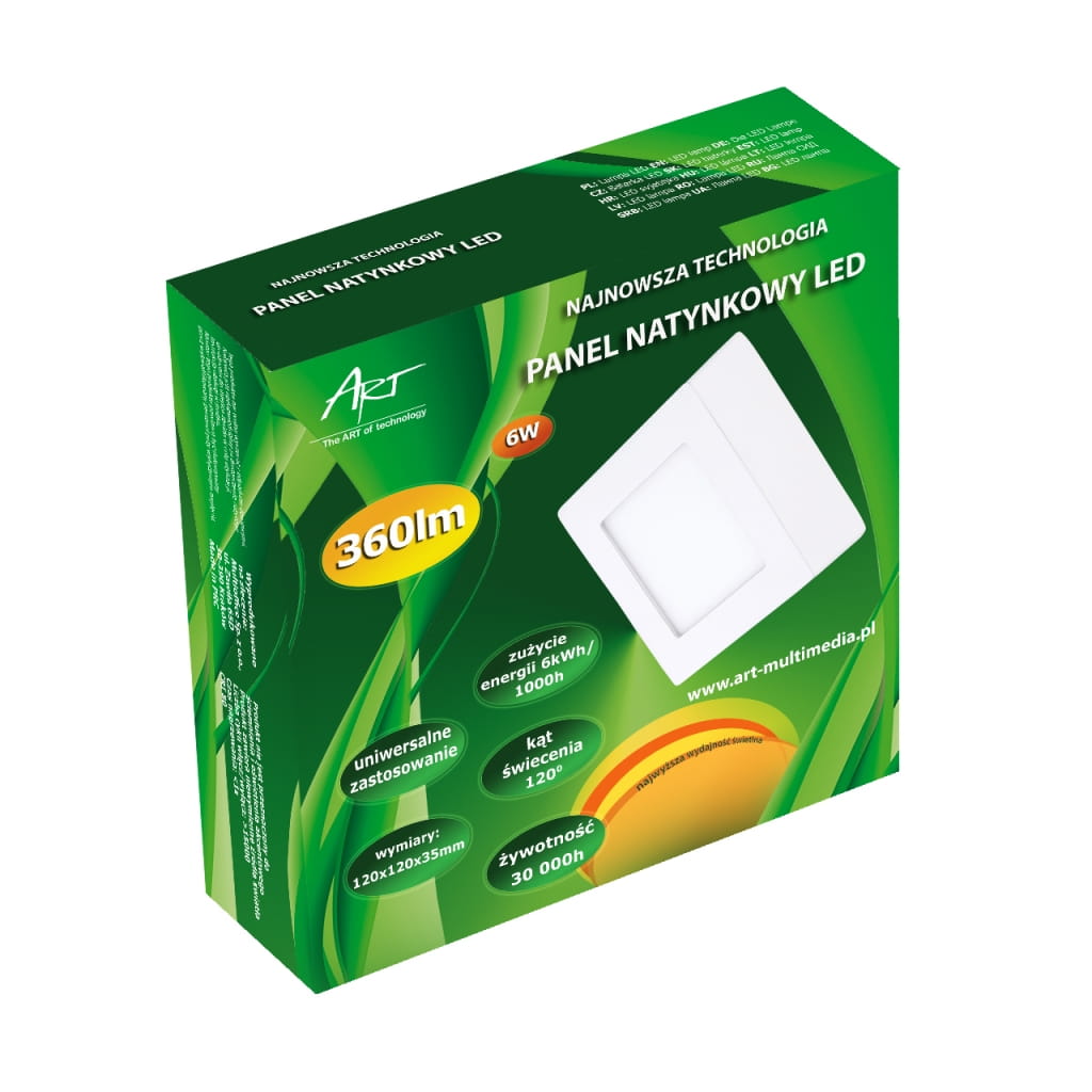 Producent: ART;Symbol producenta: 4301610;Rodzaj produktu: Panel LED natynkowy;Moc: 6W;Wodoodporność: Nie;Napięcie: AC 85-265V;Barwa światła: Ciepło-biała;Barwa światła (K): 3000;Moc strumienia świetlnego (lm): 360;Kąt świecenia (st): 120;Zastosowanie w instalacjach: Wewnętrznych;Długość lampy (mm): 120;Szerokość lampy (mm): 120;Wysokość lampy (mm): 35;Wymiary opakowania (mm): 125 x 38 x 125;Gwarancja: 24 miesiące;Zużycie energii: 6kWh/1000h;Klasa energetyczna: A;Liczba cykli włącz/wyłącz: >15 000;Czas nagrzewania: <1s;Trwałość: 30 000h;CRI/Ra: >80;Czas zapłonu: <1s;Współczynnik mocy: 0,6;LLMF: 0,65;Przeznaczenie do ściemniania: Nie;Przeznacznie do oświetlenia akcentowego: Nie;Znak bezpieczeństwa/zgodności: CE;Dopuszczenie do obrotu w RP: Tak;Kraj pochodzenia: Chiny;