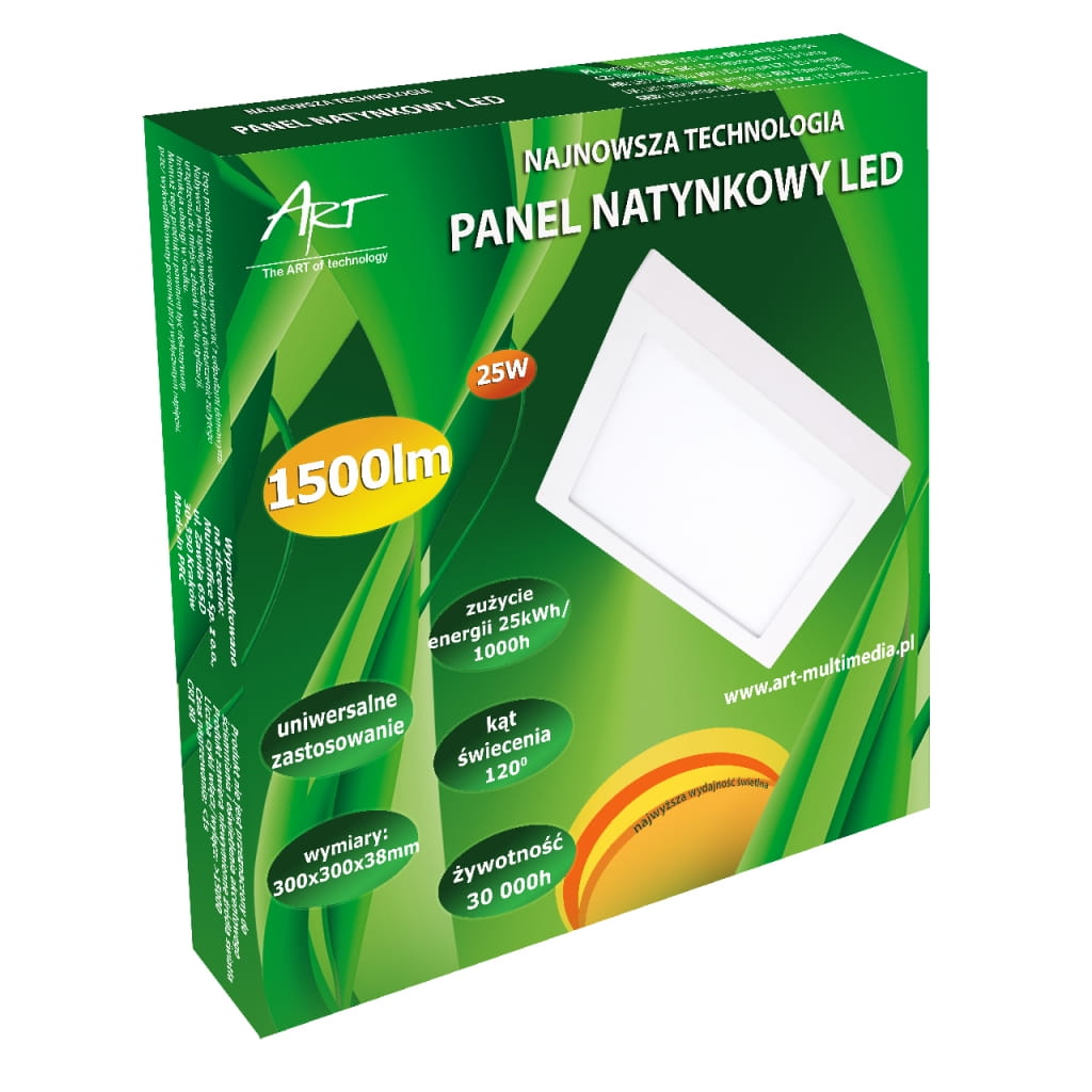 Producent: ART;Symbol producenta: 4301645;Rodzaj produktu: Panel LED natynkowy;Moc: 25W;Wodoodporność: Nie;Napięcie: AC 85-265V;Barwa światła: Biała;Barwa światła (K): 4000;Moc strumienia świetlnego (lm): 1500;Kąt świecenia (st): 120;Zastosowanie w instalacjach: Wewnętrznych;Długość lampy (mm): 300;Szerokość lampy (mm): 300;Wysokość lampy (mm): 38;Wymiary opakowania (mm): 310 x 45 x 310;Gwarancja: 24 miesiące;Zużycie energii: 25kWh/1000h;Klasa energetyczna: A;Liczba cykli włącz/wyłącz: >15 000;Czas nagrzewania: <1s;Trwałość: 30 000h;CRI/Ra: >80;Czas zapłonu: <1s;Współczynnik mocy: 0,6;LLMF: 0,65;Przeznaczenie do ściemniania: Nie;Przeznacznie do oświetlenia akcentowego: Nie;Znak bezpieczeństwa/zgodności: CE;Dopuszczenie do obrotu w RP: Tak;Kraj pochodzenia: Chiny;