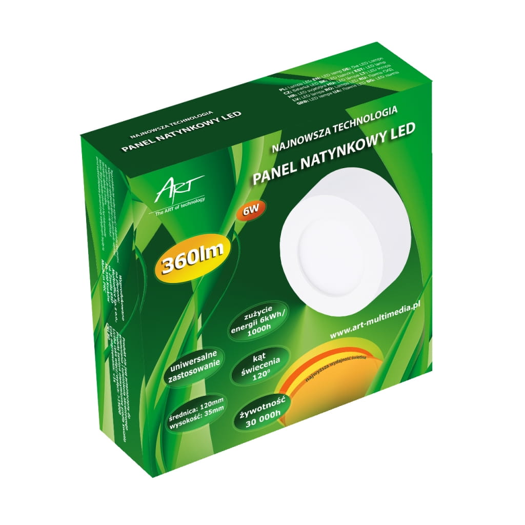 Producent: ART;Symbol producenta: 4301655;Rodzaj produktu: Panel LED natynkowy;Moc: 6W;Wodoodporność: Nie;Napięcie: AC 85-265V;Barwa światła: Biała;Barwa światła (K): 4000;Moc strumienia świetlnego (lm): 360;Kąt świecenia (st): 120;Zastosowanie w instalacjach: Wewnętrznych;Wysokość lampy (mm): 35;Średnica lampy (mm): 120;Wymiary opakowania (mm): 125 x 38 x 125;Gwarancja: 24 miesiące;Zużycie energii: 6kWh/1000h;Klasa energetyczna: A;Liczba cykli włącz/wyłącz: >15 000;Czas nagrzewania: <1s;Trwałość: 30 000h;CRI/Ra: >80;Czas zapłonu: <1s;Współczynnik mocy: 0,6;LLMF: 0,65;Przeznaczenie do ściemniania: Nie;Przeznacznie do oświetlenia akcentowego: Nie;Znak bezpieczeństwa/zgodności: CE;Dopuszczenie do obrotu w RP: Tak;Kraj pochodzenia: Chiny;