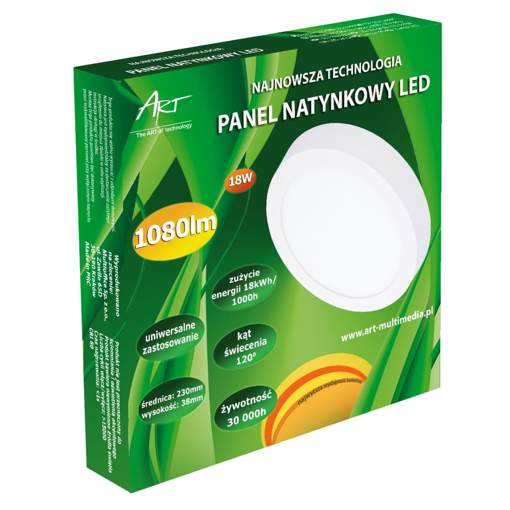 Producent: ART;Symbol producenta: 4301670;Rodzaj produktu: Panel LED natynkowy;Moc: 18W;Wodoodporność: Nie;Napięcie: AC 85-265V;Barwa światła: Ciepło-biała;Barwa światła (K): 3000;Moc strumienia świetlnego (lm): 1080;Kąt świecenia (st): 120;Zastosowanie w instalacjach: Wewnętrznych;Wysokość lampy (mm): 38;Średnica lampy (mm): 230;Wymiary opakowania (mm): 245 x 40 x 245;Gwarancja: 24 miesiące;Zużycie energii: 18kWh/1000h;Klasa energetyczna: A;Liczba cykli włącz/wyłącz: >15 000;Czas nagrzewania: <1s;Trwałość: 30 000h;CRI/Ra: >80;Czas zapłonu: <1s;Współczynnik mocy: 0,6;LLMF: 0,65;Przeznaczenie do ściemniania: Nie;Przeznacznie do oświetlenia akcentowego: Nie;Znak bezpieczeństwa/zgodności: CE;Dopuszczenie do obrotu w RP: Tak;Kraj pochodzenia: Chiny;