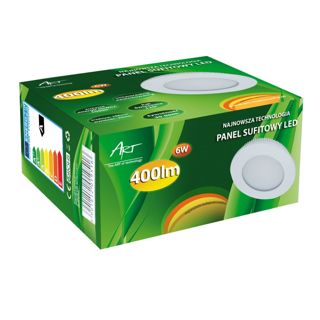 Producent: ART;Symbol producenta: 4301210;Rodzaj produktu: Panel LED podtynkowy;Moc: 6W;Materiał wykonania: Metal;Wodoodporność: Nie;Napięcie: AC 85-265V;Barwa światła: Ciepło-biała;Barwa światła (K): 3000;Moc strumienia świetlnego (lm): 400;Kąt świecenia (st): 120;Zastosowanie w instalacjach: Wewnętrznych;Wysokość lampy (mm): 33;Średnica lampy (mm): 108;Inne cechy: Głębokość otworu do montażu: 30 mm;Wymiary opakowania (mm): 120 x 115 x 60;Gwarancja: 24 miesiące;Zużycie energii: 6kWh/1000h;Klasa energetyczna: A;Liczba cykli włącz/wyłącz: >15 000;Czas nagrzewania: <1s;Trwałość: 30 000h;CRI/Ra: >80;Czas zapłonu: <1s;Współczynnik mocy: 0,6;LLMF: 0,65;Przeznaczenie do ściemniania: Nie;Przeznacznie do oświetlenia akcentowego: Nie;Znak bezpieczeństwa/zgodności: CE;Dopuszczenie do obrotu w RP: Tak;Kraj pochodzenia: Chiny;