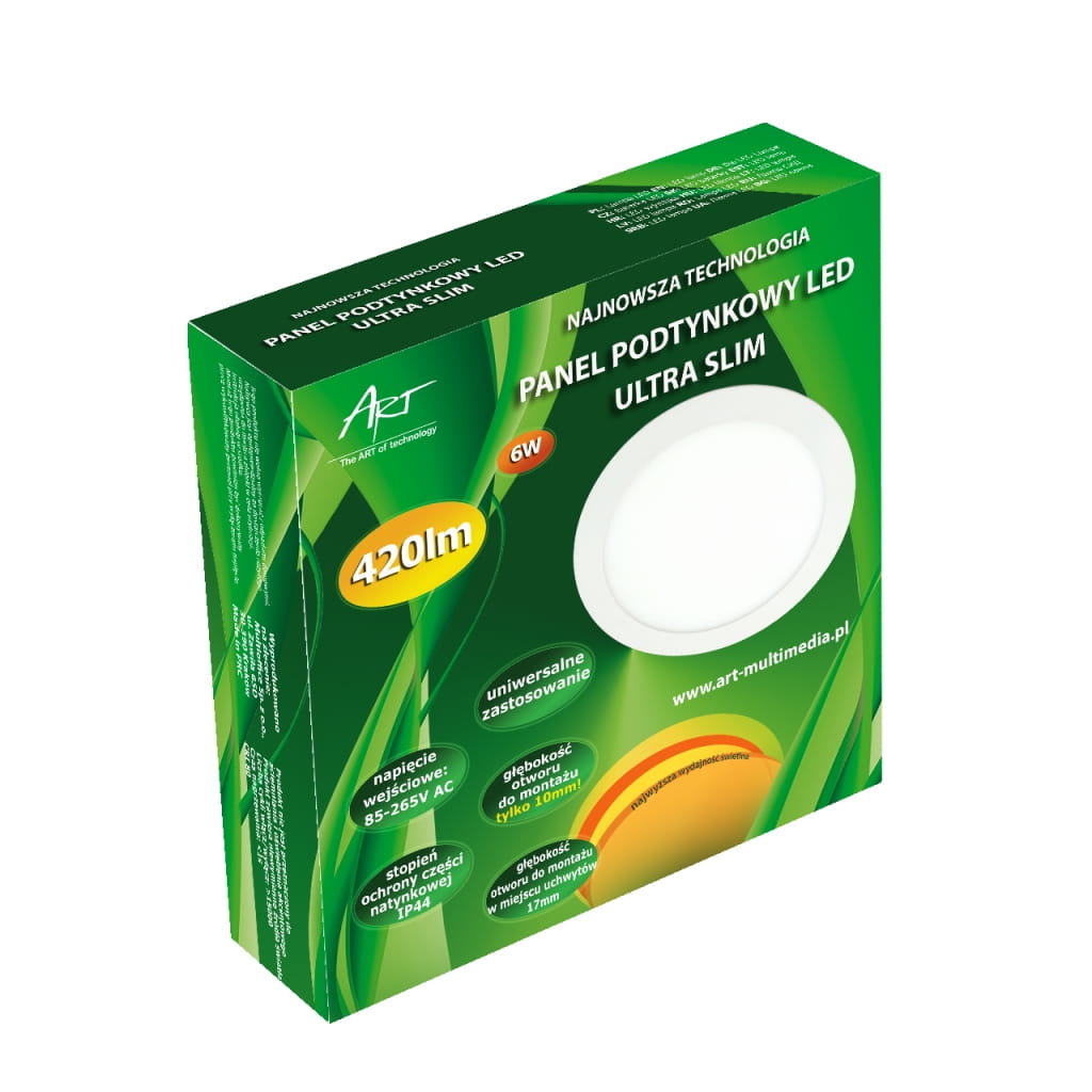 Producent: ART;Symbol producenta: 4301530;Rodzaj produktu: Panel LED ULTRA SLIM podtynkowy;Moc: 6W;Wodoodporność: Nie;Napięcie: AC 85-265V;Barwa światła: Ciepło-biała;Barwa światła (K): 3000;Moc strumienia świetlnego (lm): 420;Kąt świecenia (st): 120;Zastosowanie w instalacjach: Wewnętrznych;Wysokość lampy (mm): 12 (przy uchwytach 17);Średnica lampy (mm): 120;Inne cechy: Głębokość otworu do montażu TYLKO 10mm!;Wymiary opakowania (mm): 125 x 38 x 125;Gwarancja: 24 miesiące;Zużycie energii: 6kWh/1000h;Klasa energetyczna: A;Liczba cykli włącz/wyłącz: >15 000;Czas nagrzewania: <1s;Trwałość: 30 000h;CRI/Ra: >80;Czas zapłonu: <1s;Współczynnik mocy: 0,6;LLMF: 0,65;Przeznaczenie do ściemniania: Nie;Przeznacznie do oświetlenia akcentowego: Nie;Znak bezpieczeństwa/zgodności: CE;Dopuszczenie do obrotu w RP: Tak;Kraj pochodzenia: Chiny;