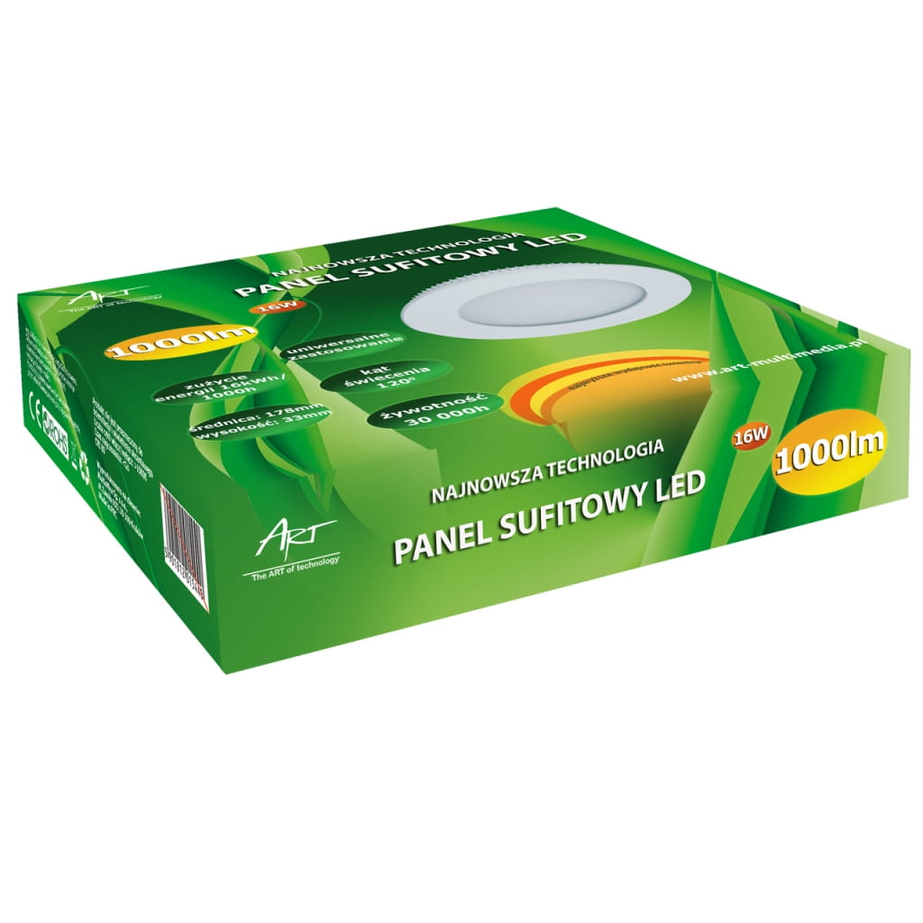 Producent: ART;Symbol producenta: 4301260;Rodzaj produktu: Panel LED podtynkowy;Moc: 16W;Materiał wykonania: Metal;Wodoodporność: Nie;Napięcie: AC 85-265V;Barwa światła: Biała;Barwa światła (K): 4000;Moc strumienia świetlnego (lm): 1000;Kąt świecenia (st): 120;Zastosowanie w instalacjach: Wewnętrznych;Wysokość lampy (mm): 33;Średnica lampy (mm): 178;Inne cechy: Klasa energetyczna A;Wymiary opakowania (mm): 220 x 50 x 205;Gwarancja: 24 miesiące;Zużycie energii: 16kWh/1000h;Klasa energetyczna: A;Liczba cykli włącz/wyłącz: >15 000;Czas nagrzewania: <1s;Trwałość: 30 000h;CRI/Ra: >80;Czas zapłonu: <1s;Współczynnik mocy: 0,6;LLMF: 0,65;Przeznaczenie do ściemniania: Nie;Przeznacznie do oświetlenia akcentowego: Nie;Znak bezpieczeństwa/zgodności: CE;Dopuszczenie do obrotu w RP: Tak;Kraj pochodzenia: Chiny;
