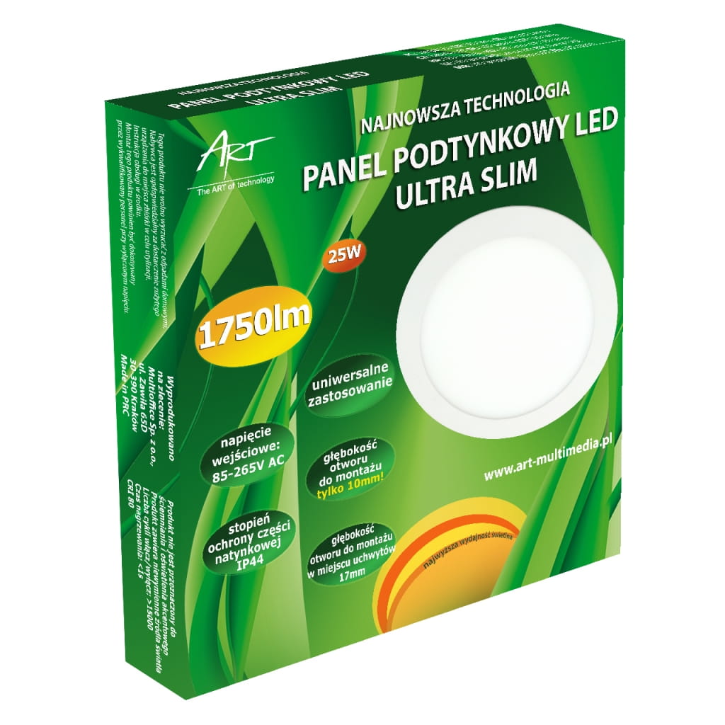 Producent: ART;Symbol producenta: 4301590;Rodzaj produktu: Panel LED ULTRA SLIM podtynkowy;Moc: 25W;Wodoodporność: Nie;Napięcie: AC 85-265V;Barwa światła: Ciepło-biała;Barwa światła (K): 3000;Moc strumienia świetlnego (lm): 1750;Kąt świecenia (st): 120;Zastosowanie w instalacjach: Wewnętrznych;Wysokość lampy (mm): 12 (przy uchwytach 17);Średnica lampy (mm): 300;Inne cechy: Głębokość otworu do montażu TYLKO 10mm!;Wymiary opakowania (mm): 310 x 45 x 310;Gwarancja: 24 miesiące;Zużycie energii: 25kWh/1000h;Klasa energetyczna: A;Liczba cykli włącz/wyłącz: >15 000;Czas nagrzewania: <1s;Trwałość: 30 000h;CRI/Ra: >80;Czas zapłonu: <1s;Współczynnik mocy: 0,6;LLMF: 0,65;Przeznaczenie do ściemniania: Nie;Przeznacznie do oświetlenia akcentowego: Nie;Znak bezpieczeństwa/zgodności: CE;Dopuszczenie do obrotu w RP: Tak;Kraj pochodzenia: Chiny;