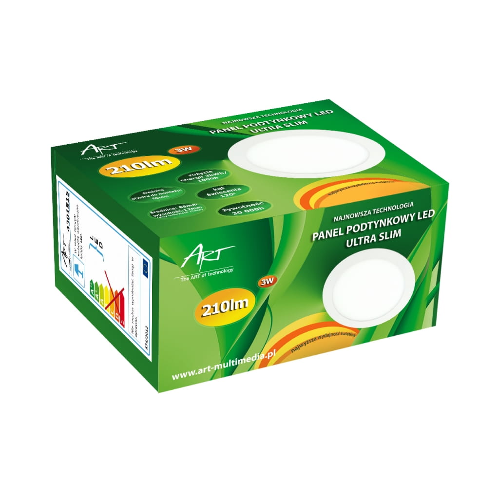 Producent: ART;Symbol producenta: 4301515;Rodzaj produktu: Panel LED ULTRA SLIM podtynkowy;Moc: 3W;Wodoodporność: Nie;Napięcie: AC 85-265V;Barwa światła: Biała;Barwa światła (K): 4000;Moc strumienia świetlnego (lm): 210;Kąt świecenia (st): 120;Zastosowanie w instalacjach: Wewnętrznych;Wysokość lampy (mm): 12 (przy uchwytach 17);Średnica lampy (mm): 85;Inne cechy: Głębokość otworu do montażu TYLKO 10mm!;Wymiary opakowania (mm): 115 x 90 x 50;Gwarancja: 24 miesiące;Zużycie energii: 3kWh/1000h;Klasa energetyczna: A;Liczba cykli włącz/wyłącz: >15 000;Czas nagrzewania: <1s;Trwałość: 30 000h;CRI/Ra: >80;Czas zapłonu: <1s;Współczynnik mocy: 0,6;LLMF: 0,65;Przeznaczenie do ściemniania: Nie;Przeznacznie do oświetlenia akcentowego: Nie;Znak bezpieczeństwa/zgodności: CE;Dopuszczenie do obrotu w RP: Tak;Kraj pochodzenia: Chiny;