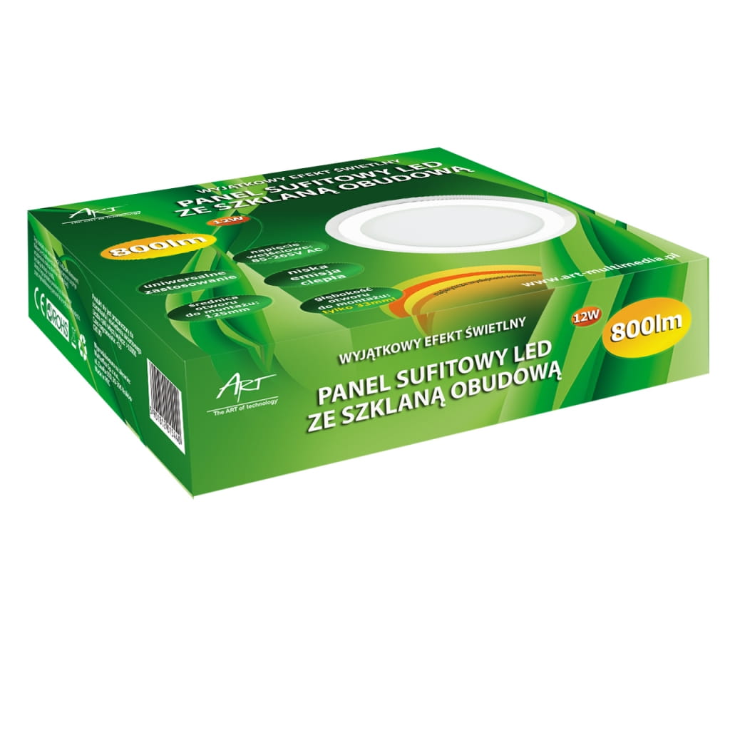 Producent: ART;Symbol producenta: 4301120;Rodzaj produktu: Panel LED ze szkłem podtynkowy;Moc: 12W;Ilość diod LED: 24;Wodoodporność: Nie;Rodzaj LED: SMD 5730;Napięcie: AC 85-265V;Barwa światła: Biała;Barwa światła (K): 4000;Moc strumienia świetlnego (lm): 800;Kąt świecenia (st): 120;Zastosowanie w instalacjach: Wewnętrznych;Wysokość lampy (mm): 43;Średnica lampy (mm): 160;Inne cechy: Głębokość otworu do montażu: 33 mm;Wymiary opakowania (mm): 185 x 45 x 175;Gwarancja: 24 miesiące;Zużycie energii: 12kWh/1000h;Klasa energetyczna: A;Liczba cykli włącz/wyłącz: >15 000;Czas nagrzewania: <1s;Trwałość: 30 000h;CRI/Ra: >80;Czas zapłonu: <1s;Współczynnik mocy: 0,6;LLMF: 0,65;Przeznaczenie do ściemniania: Nie;Przeznacznie do oświetlenia akcentowego: Nie;Znak bezpieczeństwa/zgodności: CE;Dopuszczenie do obrotu w RP: Tak;Kraj pochodzenia: Chiny;