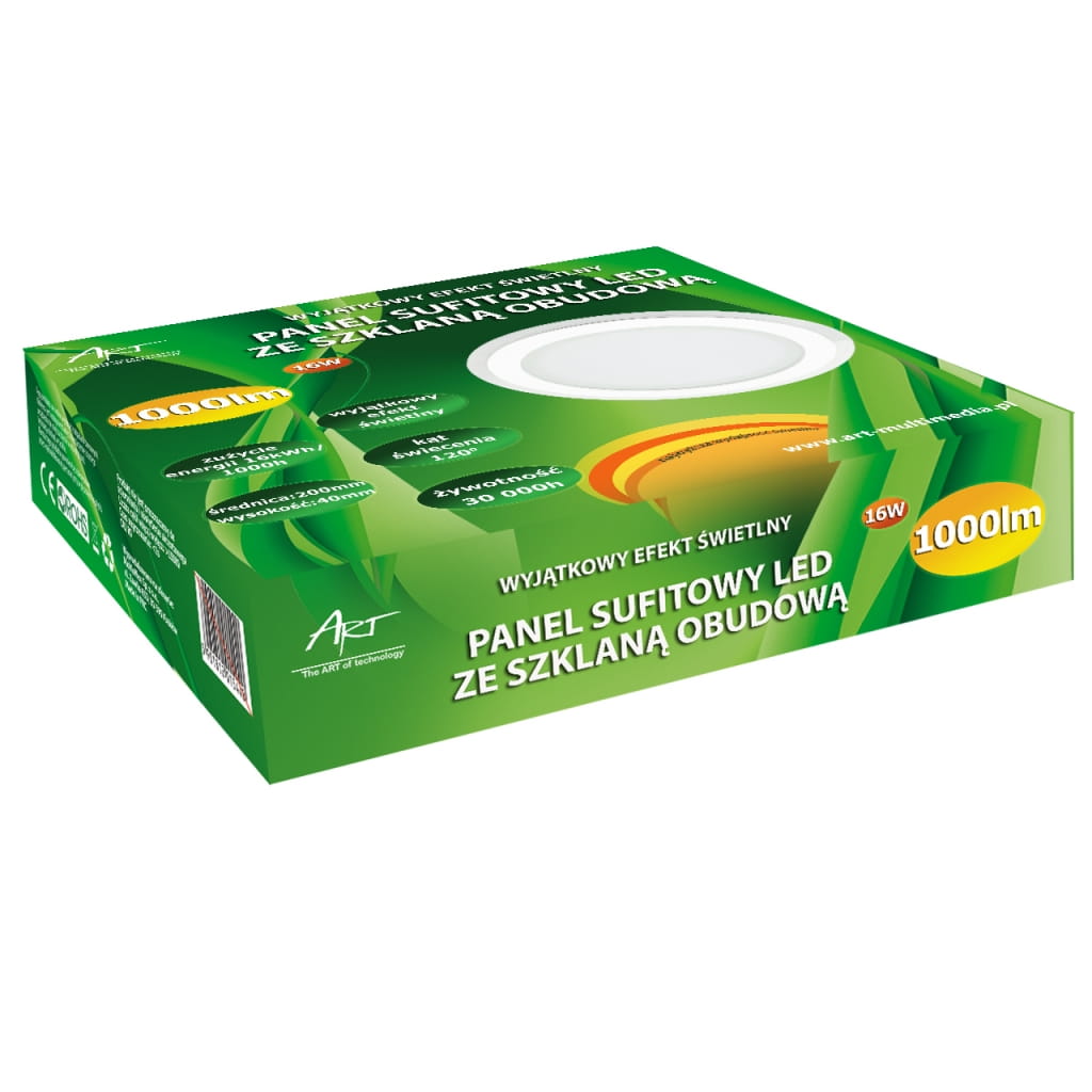 Producent: ART;Symbol producenta: 4301125;Rodzaj produktu: Panel LED ze szkłem podtynkowy;Moc: 16W;Ilość diod LED: 32;Wodoodporność: Nie;Rodzaj LED: SMD 5730;Napięcie: AC 85-265V;Barwa światła: Ciepło-biała;Barwa światła (K): 3000;Moc strumienia świetlnego (lm): 1000;Kąt świecenia (st): 120;Zastosowanie w instalacjach: Wewnętrznych;Wysokość lampy (mm): 40;Średnica lampy (mm): 200;Inne cechy: Głębokość otworu do montażu: 30 mm;Wymiary opakowania (mm): 220x50x205;Gwarancja: 24 miesiące;Zużycie energii: 16kWh/1000h;Klasa energetyczna: A;Liczba cykli włącz/wyłącz: >15 000;Czas nagrzewania: <1s;Trwałość: 30 000h;CRI/Ra: >80;Czas zapłonu: <1s;Współczynnik mocy: 0,6;LLMF: 0,65;Przeznaczenie do ściemniania: Nie;Przeznacznie do oświetlenia akcentowego: Nie;Znak bezpieczeństwa/zgodności: CE;Dopuszczenie do obrotu w RP: Tak;Kraj pochodzenia: Chiny;