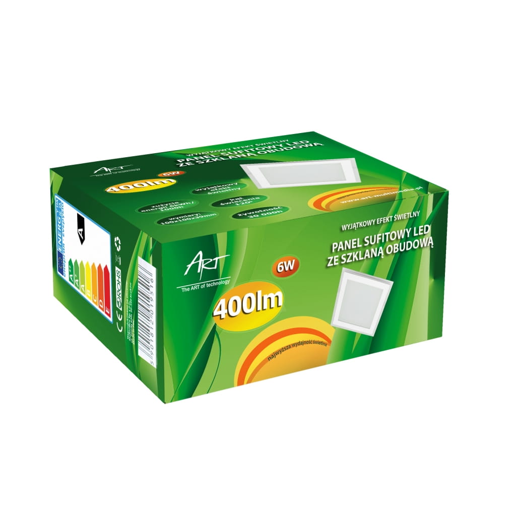 Producent: ART;Symbol producenta: 4301150;Rodzaj produktu: Panel LED ze szkłem podtynkowy;Moc: 6W;Ilość diod LED: 10;Wodoodporność: Nie;Rodzaj LED: SMD 5730;Napięcie: AC 85-265V;Barwa światła: Biała;Barwa światła (K): 4000;Moc strumienia świetlnego (lm): 400;Kąt świecenia (st): 120;Zastosowanie w instalacjach: Wewnętrznych;Długość lampy (mm): 100;Szerokość lampy (mm): 100;Wysokość lampy (mm): 39;Inne cechy: Głębokość otworu do montażu: 29 mm;Wymiary opakowania (mm): 115x115x50;Gwarancja: 24 miesiące;Zużycie energii: 6kWh/1000h;Klasa energetyczna: A;Liczba cykli włącz/wyłącz: >15 000;Czas nagrzewania: <1s;Trwałość: 30 000h;CRI/Ra: >80;Czas zapłonu: <1s;Współczynnik mocy: 0,6;LLMF: 0,65;Przeznaczenie do ściemniania: Nie;Przeznacznie do oświetlenia akcentowego: Nie;Znak bezpieczeństwa/zgodności: CE;Dopuszczenie do obrotu w RP: Tak;Kraj pochodzenia: Chiny;