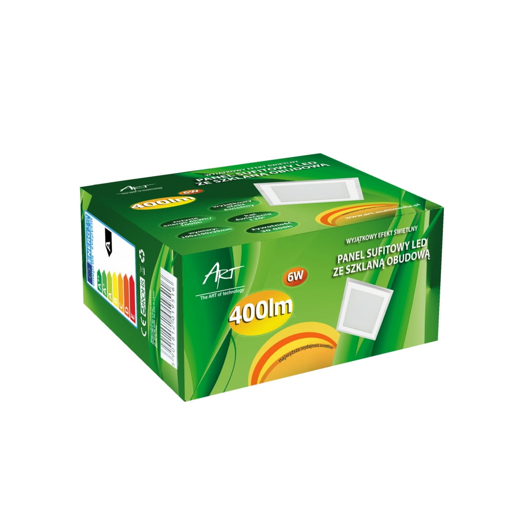 Producent: ART;Symbol producenta: 4301145;Rodzaj produktu: Panel LED ze szkłem podtynkowy;Moc: 6W;Ilość diod LED: 10;Wodoodporność: Nie;Rodzaj LED: SMD 5730;Napięcie: AC 85-265V;Barwa światła: Ciepło-biała;Barwa światła (K): 3000;Moc strumienia świetlnego (lm): 400;Kąt świecenia (st): 120;Zastosowanie w instalacjach: Wewnętrznych;Długość lampy (mm): 100;Szerokość lampy (mm): 100;Wysokość lampy (mm): 39;Inne cechy: Głębokość otworu do montażu: 29 mm;Wymiary opakowania (mm): 115 x 115 x 50;Gwarancja: 24 miesiące;Zużycie energii: 6kWh/1000h;Klasa energetyczna: A;Liczba cykli włącz/wyłącz: >15 000;Czas nagrzewania: <1s;Trwałość: 30 000h;CRI/Ra: >80;Czas zapłonu: <1s;Współczynnik mocy: 0,6;LLMF: 0,65;Przeznaczenie do ściemniania: Nie;Przeznacznie do oświetlenia akcentowego: Nie;Znak bezpieczeństwa/zgodności: CE;Dopuszczenie do obrotu w RP: Tak;Kraj pochodzenia: Chiny;