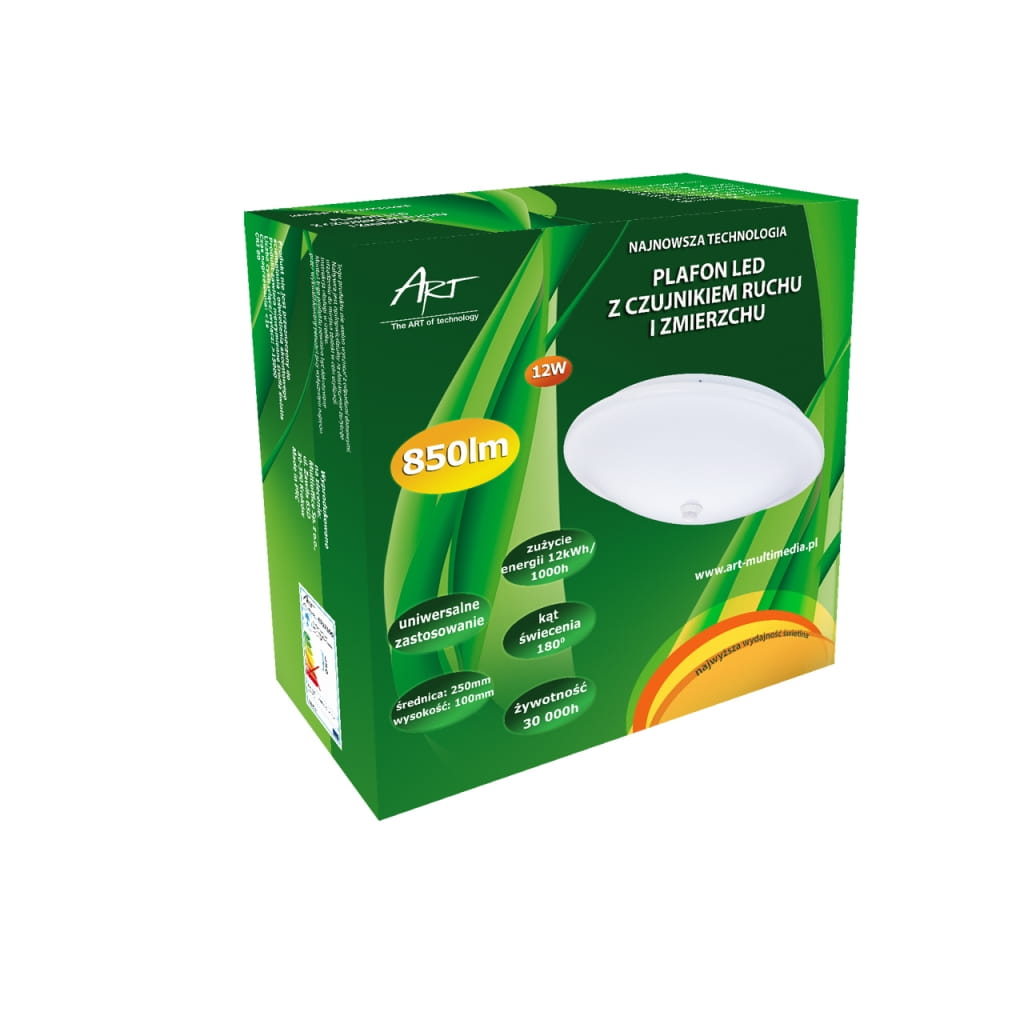Producent: ART;Symbol producenta: 4312060;Rodzaj produktu: Plafon LED z PIR;Moc: 12W;Wodoodporność: Nie;Napięcie: AC 230V;Barwa światła: Biała;Barwa światła (K): 4000;Moc strumienia świetlnego (lm): 850;Kąt świecenia (st): 180;Zastosowanie w instalacjach: Wewnętrznych;Wysokość lampy (mm): 100;Średnica lampy (mm): 250;Inne cechy: Wbudowany czujnik ruchu i zmierzchu;Wymiary opakowania (mm): 265 x 125 x 265;Gwarancja: 24 miesiące;Zużycie energii: 12kWh/1000h;Klasa energetyczna: A;Liczba cykli włącz/wyłącz: >15 000;Czas nagrzewania: <1s;Trwałość: 30 000h;CRI/Ra: >80;Czas zapłonu: <1s;Współczynnik mocy: 0,6;LLMF: 0,65;Przeznaczenie do ściemniania: Nie;Przeznacznie do oświetlenia akcentowego: Nie;Znak bezpieczeństwa/zgodności: CE;Dopuszczenie do obrotu w RP: Tak;Kraj pochodzenia: Chiny;