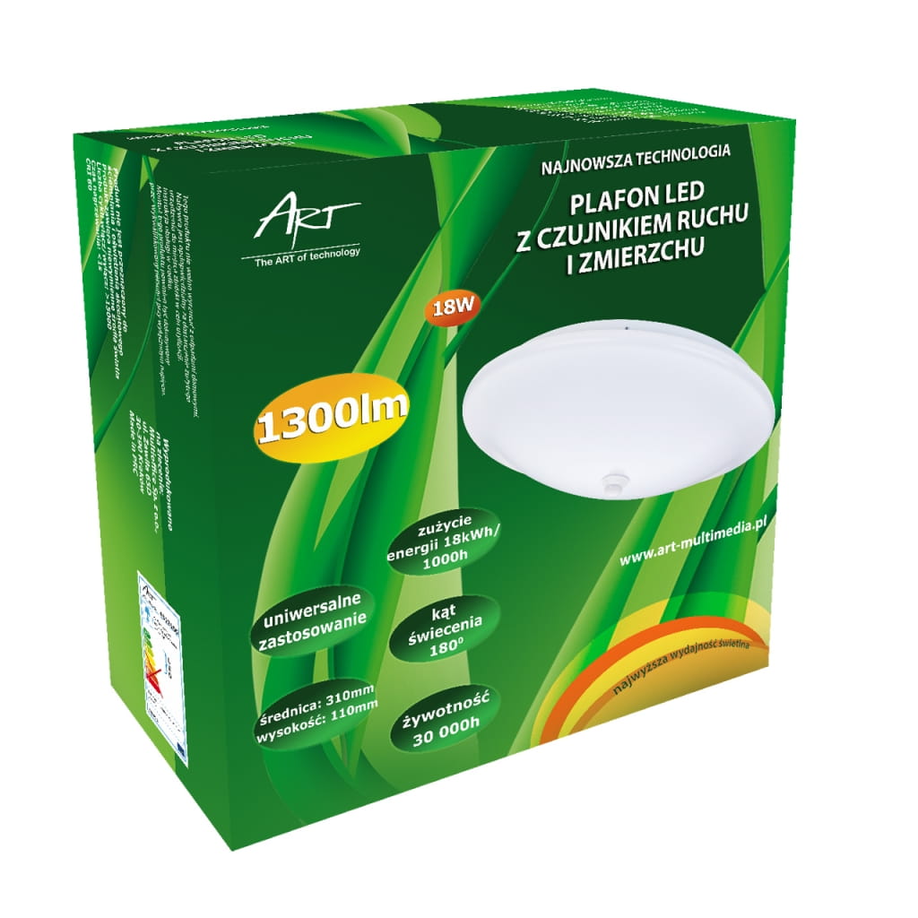Producent: ART;Symbol producenta: 4312080;Rodzaj produktu: Plafon LED z PIR;Moc: 18W;Wodoodporność: Nie;Napięcie: AC 230V;Barwa światła: Biała;Barwa światła (K): 4000;Moc strumienia świetlnego (lm): 1300;Kąt świecenia (st): 180;Zastosowanie w instalacjach: Wewnętrznych;Wysokość lampy (mm): 110;Średnica lampy (mm): 310;Inne cechy: Wbudowany czujnik ruchu i zmierzchu;Wymiary opakowania (mm): 325 x 130 x 325;Gwarancja: 24 miesiące;Zużycie energii: 18kWh/1000h;Klasa energetyczna: A;Liczba cykli włącz/wyłącz: >15 000;Czas nagrzewania: <1s;Trwałość: 30 000h;CRI/Ra: >80;Czas zapłonu: <1s;Współczynnik mocy: 0,6;LLMF: 0,65;Przeznaczenie do ściemniania: Nie;Przeznacznie do oświetlenia akcentowego: Nie;Znak bezpieczeństwa/zgodności: CE;Dopuszczenie do obrotu w RP: Tak;Kraj pochodzenia: Chiny;
