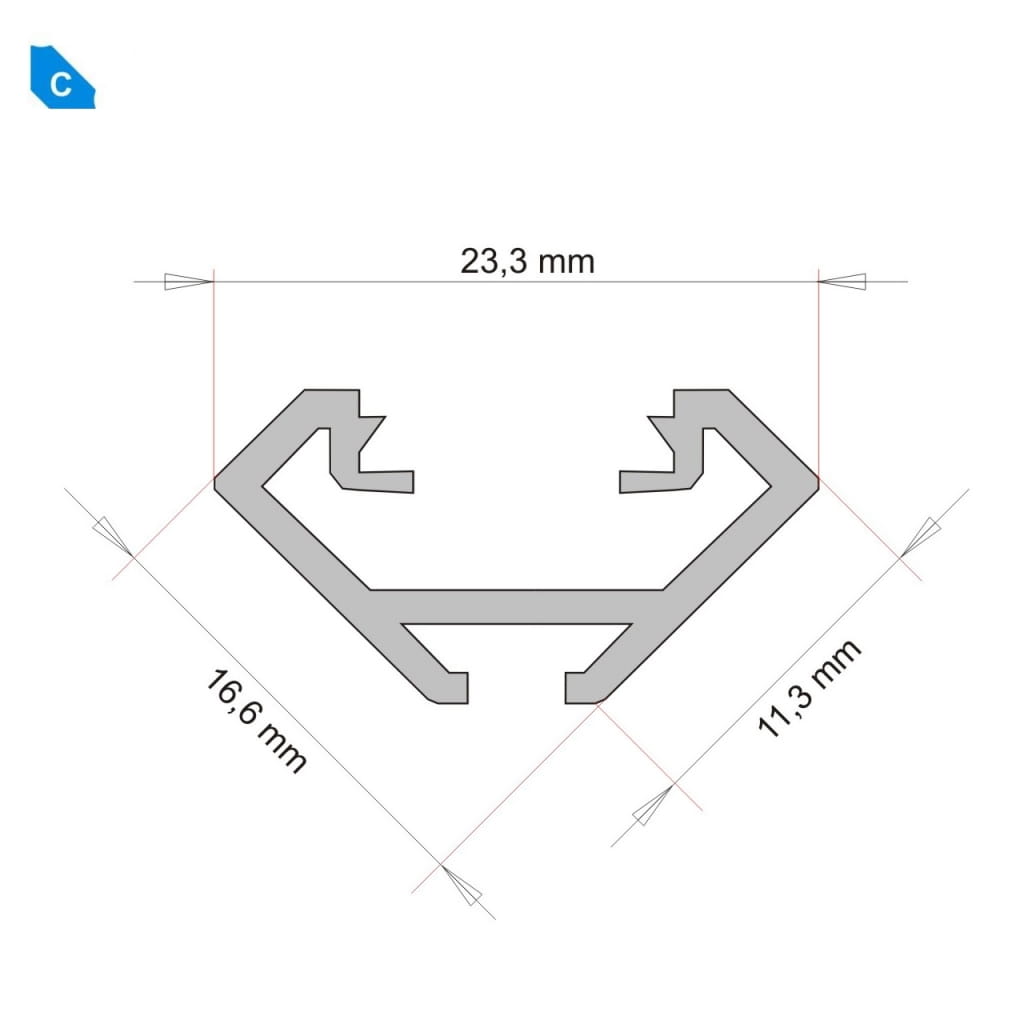 Symbol producenta: ALU C 2M;Rodzaj produktu: Profil aluminiowy typ C;Profil: Narożny;Długość (m): 1;Wymiary: 16,6 x 23,3 x 11,3 mm;Kolor: Srebrny;Dopuszczenie do obrotu w RP: Tak;Kraj pochodzenia: Polska;