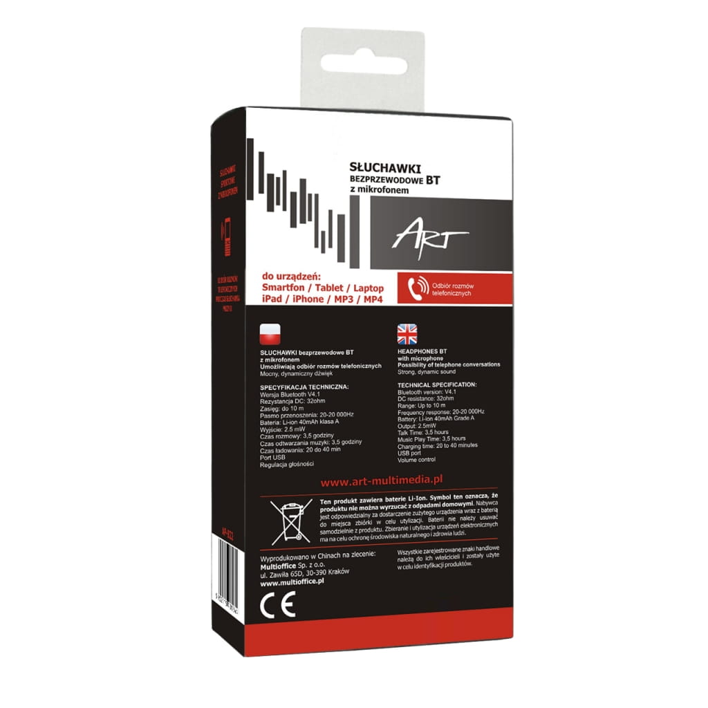 Producent: ART;Symbol producenta: AP-B22;Rodzaj produktu: Słuchawki douszne Bluetooth;Rodzaj złącza: BLUETOOTH;Pasmo przenoszenia: 20Hz-20KHz;Impedancja: 32 ohm;Inne cechy: Lekkie, wyposażone w mały pilot słuchawki stereo dla aktywnych ;Mikrofon: Tak;Gwarancja: 24 miesiące;Znak bezpieczeństwa/zgodności: CE;Dopuszczenie do obrotu w RP: Tak;Kraj pochodzenia: Chiny;