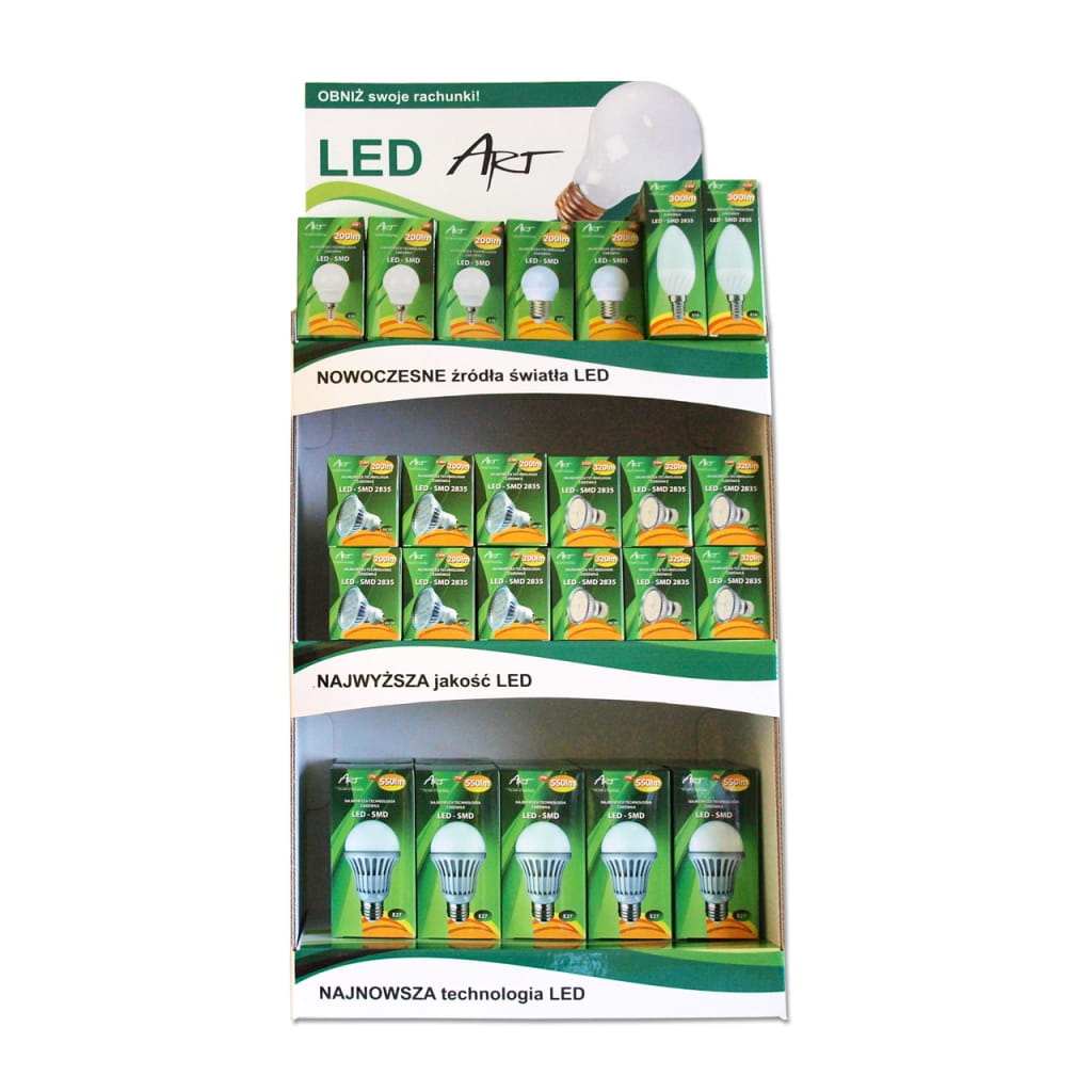 Producent: ART;Symbol producenta: L-100;Przeznaczenie: Ekspozycja żarówek LED;Wysokość : 70 cm;Szerokość : 34,5 cm;Głębokość: 30 cm;Materiał wykonania: Karton;