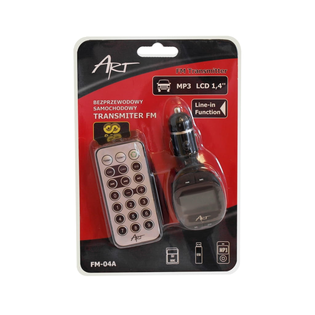 Producent: ART;Symbol producenta: FM-04A;Rodzaj produktu: Transmiter samochodowy FM ;Przeznaczenie: Odtwarza i przesyła muzykę MP3/WMA lub pliki audio do radia samochodwego ;Rodzaj transmisji: Bezprzewodowa;Wielkość i rodzaj ekranu: LCD 1.4" ;Pilot w zestawie: Tak;Gniazdo USB: Tak, maksymalnie 32GB ;Gniazdo kart pamięci: Tak (SD i MMC), maksymalnie 32GB ;Inne cechy: Wysoka jakość transmitowanego dźwięku. Regulowany przegub. Zasilanie z gniazda zapalniczki samochodowej 12/24V.;Gwarancja: 24 miesiące;Znak bezpieczeństwa/zgodności: CE;Dopuszczenie do obrotu w RP: Tak;Kraj pochodzenia: Chiny;