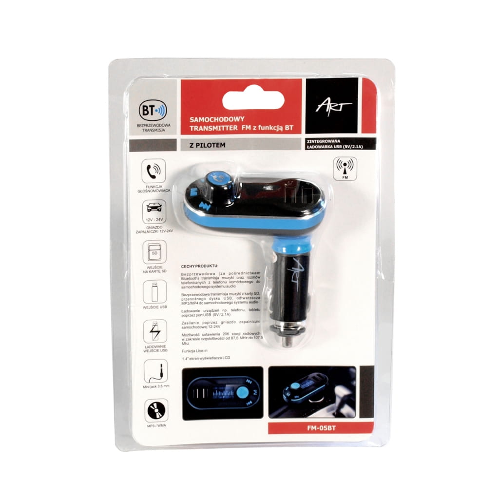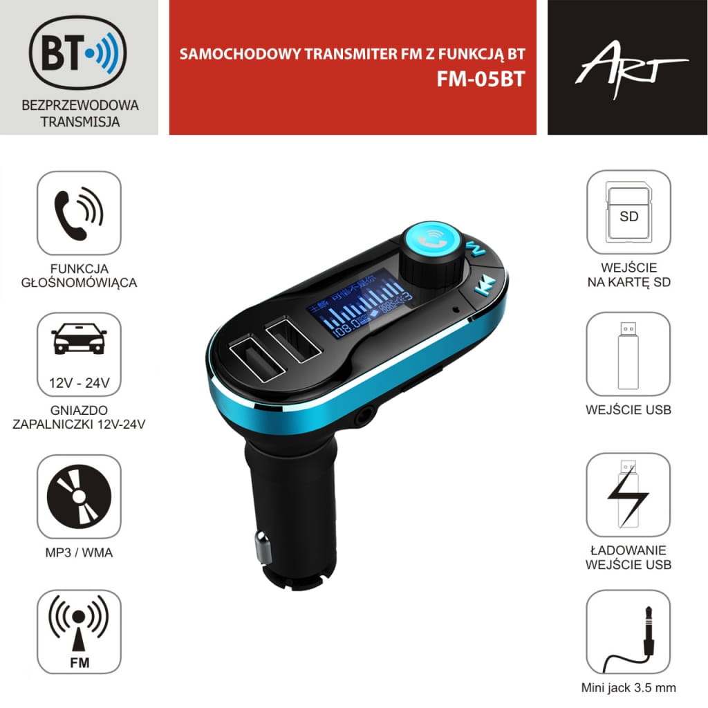 Producent: ART;Symbol producenta: FM-05BT;Rodzaj produktu: Transmiter samochodowy FM z transmisją bluetooth oraz funkcją zestawu głośnomówiącego;Przeznaczenie: Telefony z funkcją bluetooth;Rodzaj transmisji: Bezprzewodwa: bluetooth oraz FM;Wielkość i rodzaj ekranu: 1.4" LCD;Pilot w zestawie: Tak;Gniazdo USB: Tak, 5V/2.1A;Gniazdo kart pamięci: SD;Inne cechy: Bezprzewodowa (za pośrednictwem Bluetooth) transmisja muzyki oraz rozmów telefonicznych z telefonu komórkowego do samochodowego systemu audio. Bezprzewodowa transmisja muzyki z kart SD, przenośnego dysku USB, odtwarzacza MP3/MP4 do samoch. systemu audio.;Gwarancja: 24 miesiące;Znak bezpieczeństwa/zgodności: CE;Dopuszczenie do obrotu w RP: Tak;Kraj pochodzenia: Chiny;