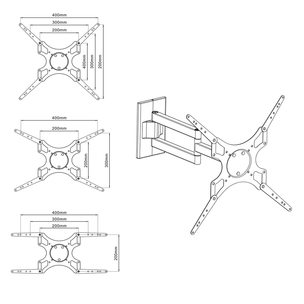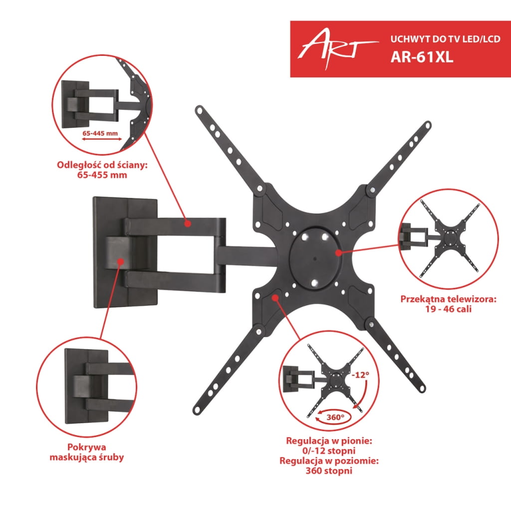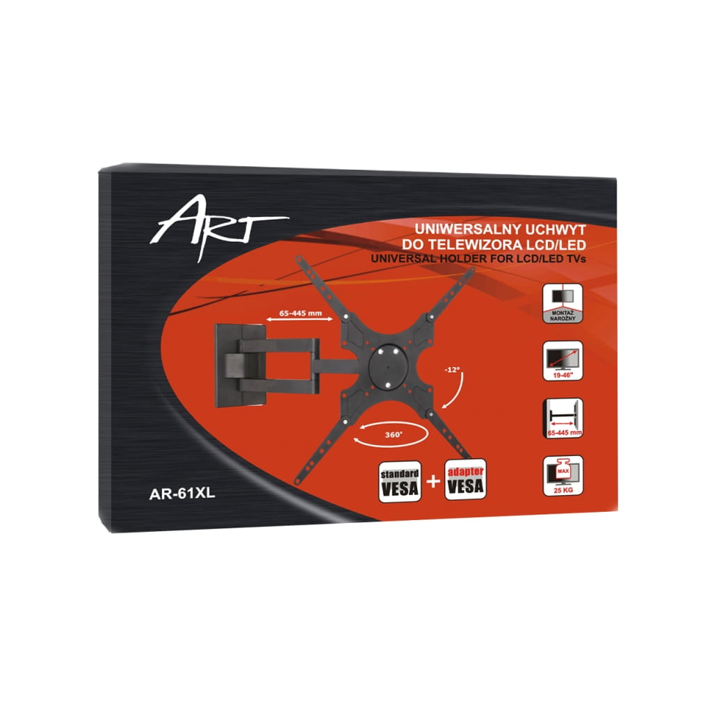 Producent: ART;Symbol producenta: AR-61XL;Rodzaj produktu: Uchwyt ścienny do telewizora;Zastosowanie: Montaż TV LCD/LED;Standard VESA: Tak;Rozmiar telewizora: 19-46 cali ;Maksymalna waga telewizora: 25 kg;Maksymalny rozstaw otworów pod uchwyt: 75 x 75, 100 x 100, 200 x 100, 200 x 200, 300x300, 400 x 300, 400 x 400 mm;Regulacja w pionie (nachył): do -12 stopni;Regulacja w poziomie (obrót): 360 stopni;Mocowanie do sufitu: Nie;Mocowanie do ściany: Tak;Odległość od ściany: 65-445 mm;Uchwyt narożny: Tak;Wymiary uchwytu: (szer x wys głęb) 410 x 410 x 65-445 mm;Materiał wykonania: Metal;Sposób lakierowania: Proszkowo;Kolor: Czarny;Zestaw śrub do montażu: Tak;Inne cechy: Rozbudowana o dodatkowy adapter wersja modelu AR-61. ;Gwarancja: 24 miesiące;Dopuszczenie do obrotu w RP: Tak;Kraj pochodzenia: Chiny;