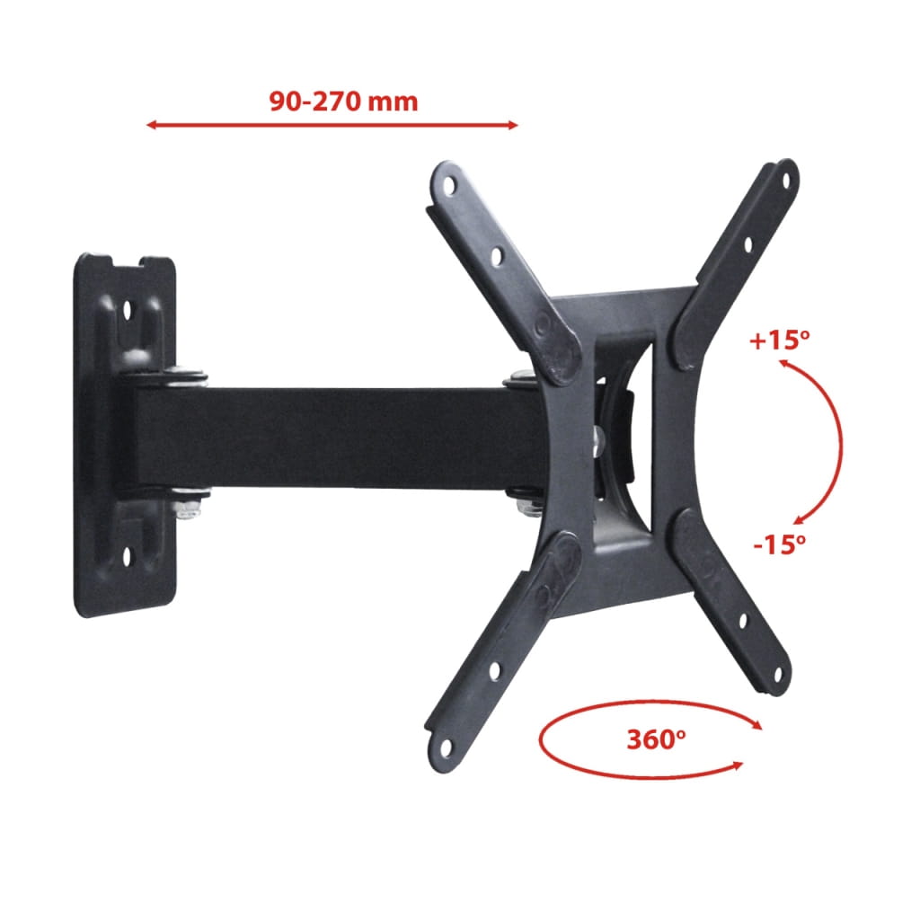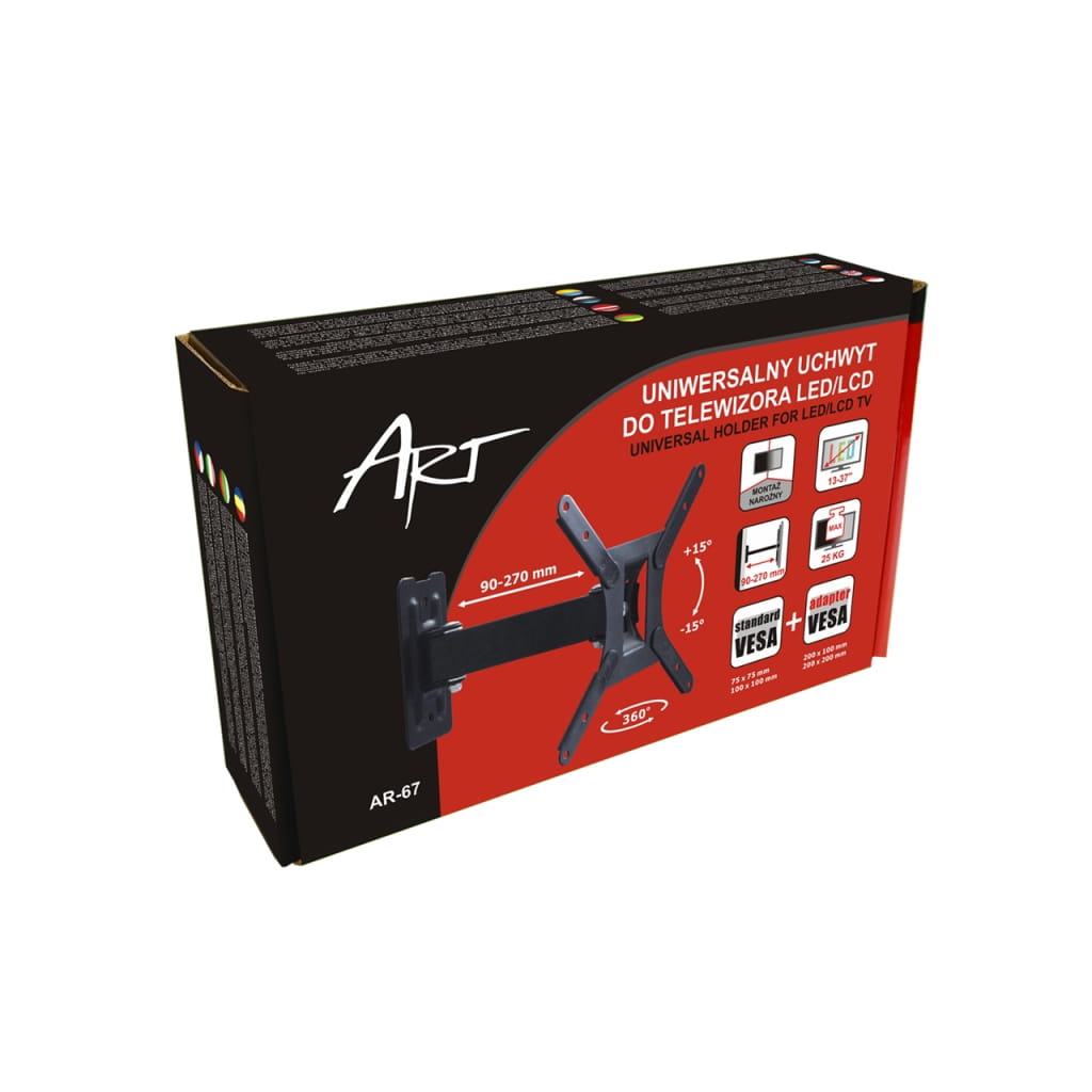 Producent: ART;Symbol producenta: AR-67;Rodzaj produktu: Uchwyt ścienny do telewizora;Zastosowanie: Montaż TV LED/LCD ;Standard VESA: Tak;Rozmiar telewizora: 13-37 cali;Maksymalna waga telewizora: 25kg;Maksymalny rozstaw otworów pod uchwyt: 75x75, 100x100, 200x100, 200x200;Regulacja w pionie (nachył): od -15 do +15 stopni;Regulacja w poziomie (obrót): 360 stopni;Mocowanie do ściany: Tak;Odległość od ściany: 90-270 mm;Uchwyt narożny: Tak;Wymiary uchwytu: 230 x 230 x 90-270 mm;Materiał wykonania: Metal;Sposób lakierowania: Proszkowo;Kolor: Czarny;Zestaw śrub do montażu: Tak;Inne cechy: Uchwyt przeznaczony do małych TV. ;Gwarancja: 24 miesiące;Dopuszczenie do obrotu w RP: Tak;Kraj pochodzenia: Chiny;