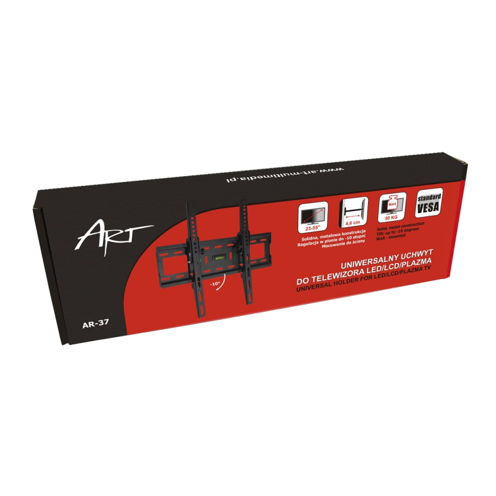 Producent: ART;Symbol producenta: AR-37;Rodzaj produktu: Uchwyt ścienny do telewizora;Zastosowanie: Montaż telewizora;Standard VESA: Tak;Rozmiar telewizora: 23-55 cali;Maksymalna waga telewizora: 50 kg;Maksymalny rozstaw otworów pod uchwyt: 400 x 400, 400x300, 400x200, 300x300, 300x200, 200x200 mm;Regulacja w pionie (nachył): do -10 stopni;Regulacja w poziomie (obrót): Nie;Mocowanie do ściany: Tak;Odległość od ściany: 46 mm;Uchwyt narożny: Nie;Wymiary uchwytu: 450 x 430 x 46 mm;Materiał wykonania: Metal;Sposób lakierowania: Proszkowo;Kolor: Czarny;Zestaw śrub do montażu: Tak;Inne cechy: Uniwersalny, pasuje do większości telewizorów LCD, LED, PLAZMA;Gwarancja: 24 miesiące;Dopuszczenie do obrotu w RP: Tak;Kraj pochodzenia: Chiny;