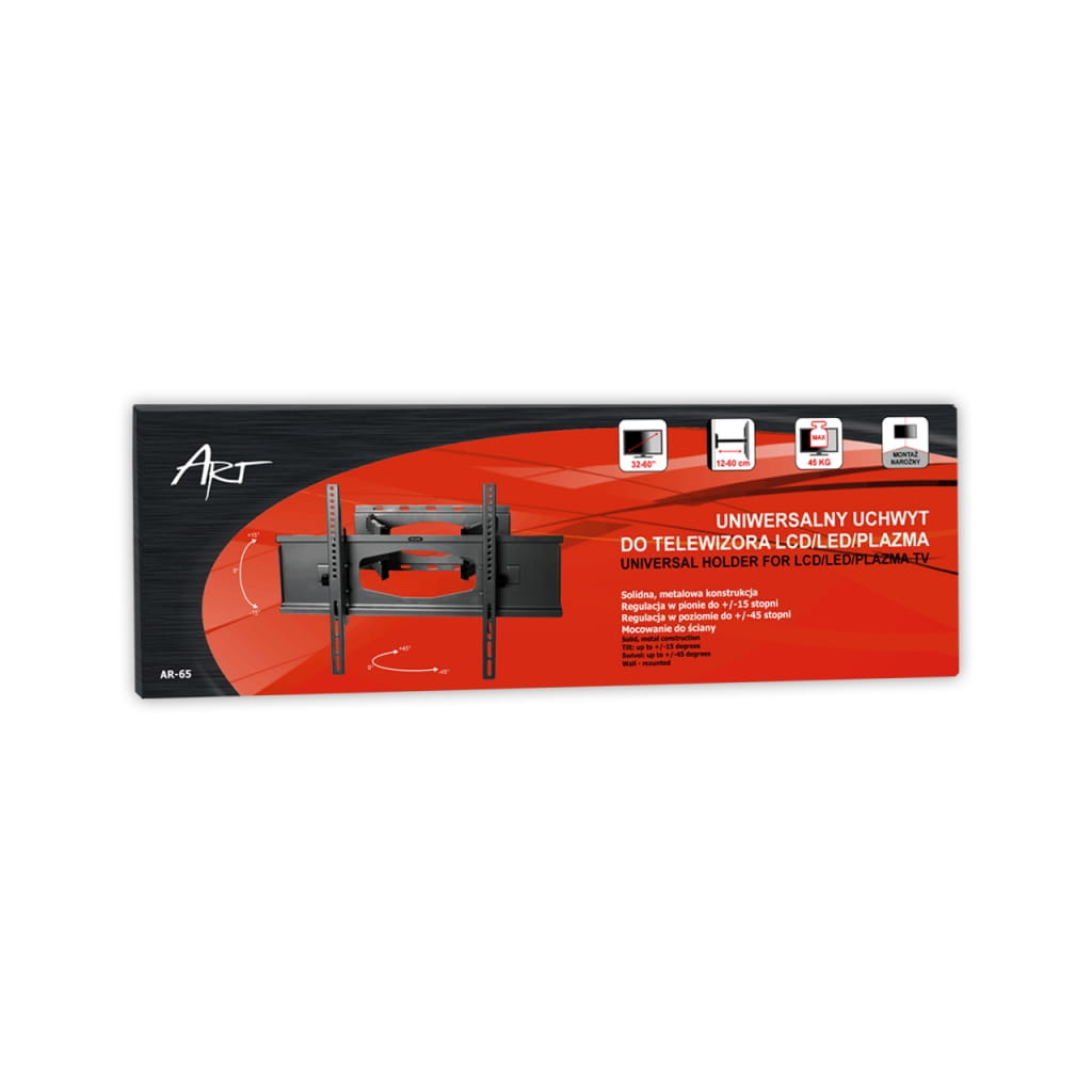 Producent: ART;Symbol producenta: AR-65;Rodzaj produktu: Uchwyt ścienny do telewizora;Zastosowanie: Montaż telewizora LCD/LED/PLAZMA;Standard VESA: Tak;Rozmiar telewizora: 32-60 cali;Maksymalna waga telewizora: 45 kg;Maksymalny rozstaw otworów pod uchwyt: 600x400, 400x400, 400x300, 300x300, 300x200, 200x200mm;Regulacja w pionie (nachył): od -15 do +15 stopni;Regulacja w poziomie (obrót): od -45 do +45 stopni;Mocowanie do sufitu: Nie;Mocowanie do ściany: Tak;Odległość od ściany: 120-600 mm;Uchwyt narożny: Tak;Wymiary uchwytu: 660 x 470 x 120-600 mm;Materiał wykonania: Metal;Sposób lakierowania: Proszkowo;Kolor: Czarny;Zestaw śrub do montażu: Tak;Inne cechy: Idealny do montażu narożnego;Gwarancja: 24 miesiące;Dopuszczenie do obrotu w RP: Tak;Kraj pochodzenia: Chiny;
