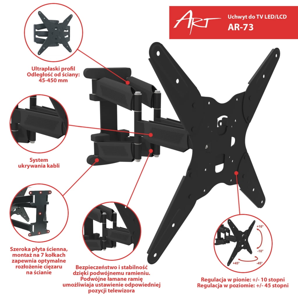Producent: ART;Symbol producenta: AR-73;Rodzaj produktu: Uchwyt ścienny do telewizora;Zastosowanie: Montaż TV LCD/LED;Standard VESA: Tak;Rozmiar telewizora: 19-55 cali ;Maksymalna waga telewizora: 35kg;Maksymalny rozstaw otworów pod uchwyt: 75x75, 100x100, 200x100, 200x200, 300x200, 300x300, 400x300, 400x400;Regulacja w pionie (nachył): -10 do 10 stopni;Regulacja w poziomie (obrót): -45 do 45 stopni;Mocowanie do sufitu: Nie;Mocowanie do ściany: Tak;Odległość od ściany: 45-450 mm;Uchwyt narożny: Tak;System ukrywania kabli: Tak;Wymiary uchwytu: 436x436x45-450mm;Materiał wykonania: Metal;Sposób lakierowania: Proszkowo;Kolor: Czarny;Zestaw śrub do montażu: Tak;Inne cechy: Pełne bezpieczeństwo oraz stabilność dzięki podwójnemu ramieniu. Szeroka płyta ścienna oraz możliwośc instalacji nawet na 7 śrubach co pozwala zawieścić TV na mniej stablinych ścianach..;Gwarancja: 24 miesiące;Dopuszczenie do obrotu w RP: Tak;Kraj pochodzenia: Chiny;