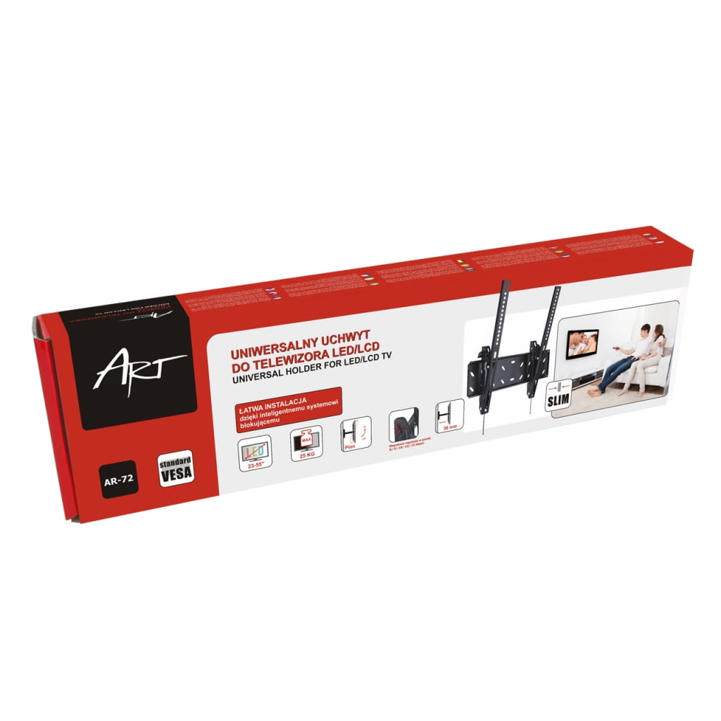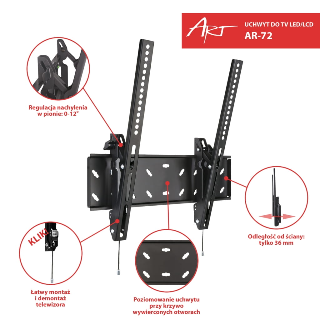 Producent: ART;Symbol producenta: AR-72;Rodzaj produktu: Uchwyt ścienny do telewizora ;Zastosowanie: Montaż TV LED/LCD;Standard VESA: Tak;Rozmiar telewizora: 23-55 cali;Maksymalna waga telewizora: 25kg;Maksymalny rozstaw otworów pod uchwyt: 400x400, 400x300, 400x200, 300x300,300x200, 200x200;Regulacja w pionie (nachył): -0 do 15 stopni;Regulacja w poziomie (obrót): brak;Mocowanie do ściany: Tak;Odległość od ściany: 36mm;Blokada zabezpieczająca TV przed zsunięciem: Tak;Wymiary uchwytu: 450x425x36mm;Materiał wykonania: Metal;Sposób lakierowania: Proszkowo;Kolor: Czarny;Zestaw śrub do montażu: Tak;Inne cechy: Łatwa instalacja dzięki inteligentnemu systemowi blokującymi. KLIK i gotowe ! Po przykręceniu pionowych wsporników do telewizora, wystarczy je docisnąć do płyty ściennej a uchwyt zablokuje się samoczynnie. ;Gwarancja: 24 miesiące;Dopuszczenie do obrotu w RP: Tak;Kraj pochodzenia: Chiny;