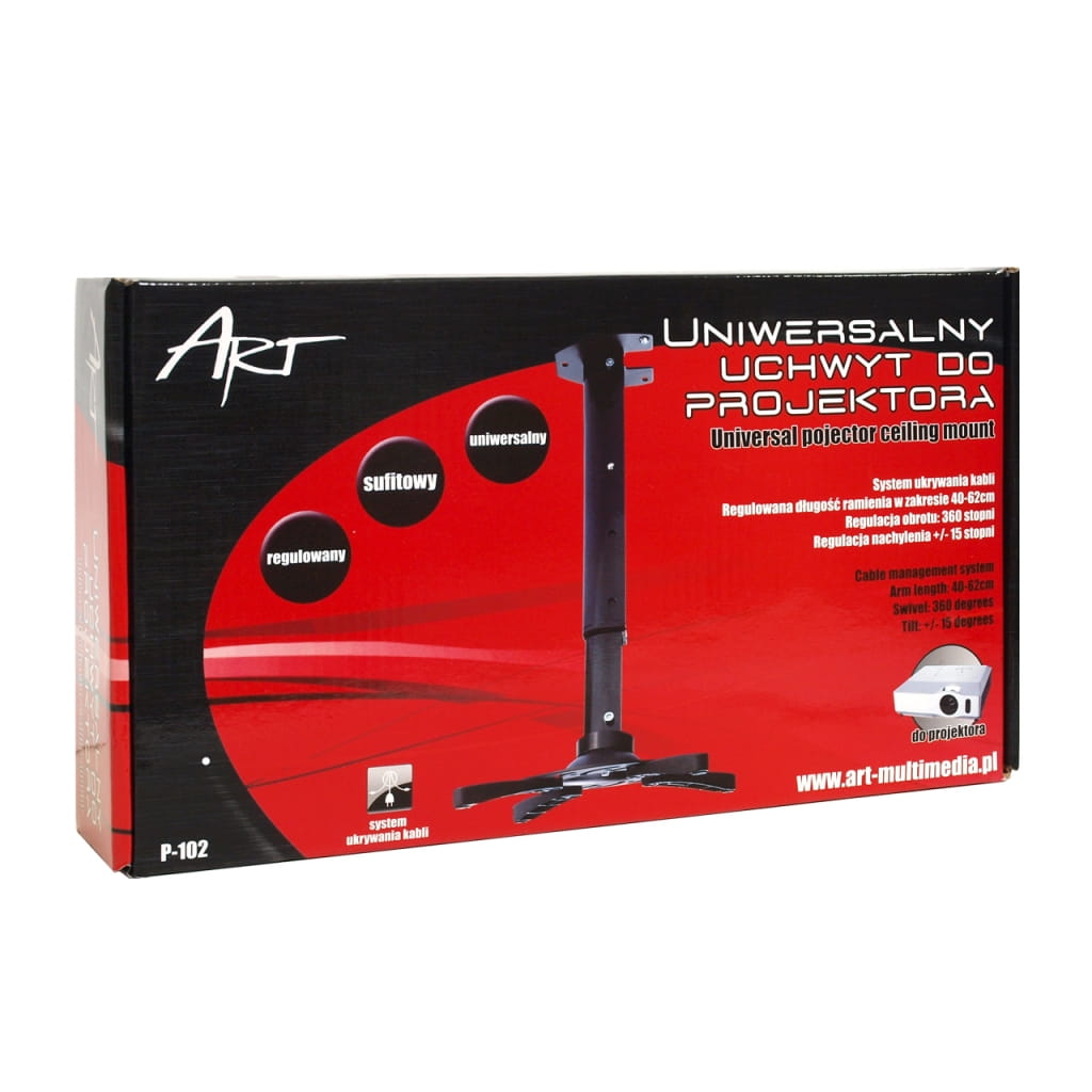 Producent: ART;Symbol producenta: P-102B-AL;Rodzaj produktu: Uchwyt sufitowy do projektora;Zastosowanie: Montaż projektora;Rozstaw otworów do montażu: Regulowany-uniwersalny;Maksymalna waga projektora: 15 kg;Regulacja w pionie (nachył): od -15 do +15 stopni;Regulacja w poziomie (obrót): 360 stopni;Mocowanie do sufitu: Tak;Mocowanie do ściany: Nie;Odległość od sufitu: od 40 do 62cm;Odległość od ściany: 118 mm;System ukrywania kabli: Tak;Blokada zabezpieczająca projektor przed zsunięciem: Tak;Wymiary uchwytu: (szer x dł x wys) 322 x 322 x 400-620 mm;Materiał wykonania: Aluminiowo-metalowe;Kolor: Czarny;Sposób lakierowania: Proszkowo;Zestaw śrub do montażu: Tak;Inne cechy: Posiada system ukrywania kabli;Gwarancja: 24 miesiące;Dopuszczenie do obrotu w RP: Tak;Kraj pochodzenia: Chiny;