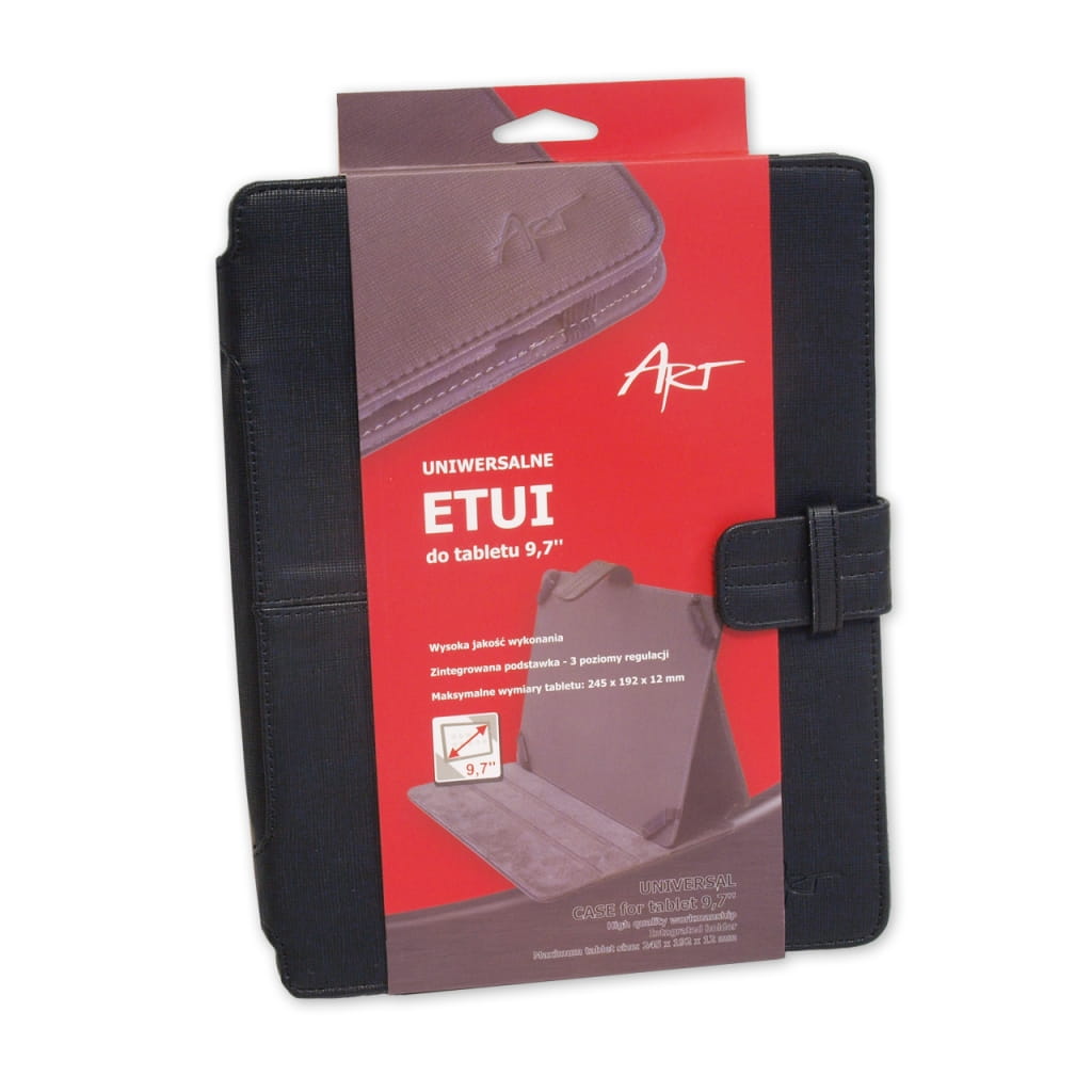 Producent: ART;Symbol producenta: T-09;Rodzaj produktu: Etui do tabletu;Przeznaczenie: Uniwersalne;Przykładowe modele: GoClever 9.7", Lark 9.7", Manta 9.7", iPad, iPad2, iPad3, iPad Retina;Materiał wykonania : Tworzywo skóropodobne;Wielkość i rodzaj ekranu: 9.7 cala;Inne cechy: Uniwersalne do większości tabletów 9.7" dzięki elastycznym gumkom znajdującym się w każdym rogu etui;Gwarancja: 24 miesiące;Znak bezpieczeństwa/zgodności: CE;Dopuszczenie do obrotu w RP: Tak;Kraj pochodzenia: Chiny;