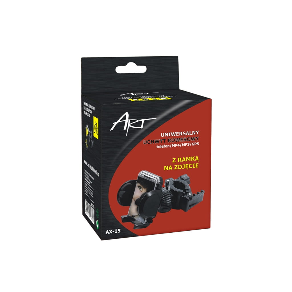 Producent: ART;Symbol producenta: AX-15;Rodzaj produktu: UNIWERSALNY UCHWYT ROWEROWY NA TELEFON/MP4/GPS;Materiał wykonania : Plastik;Kolor: Czarny;Inne cechy: Swobodna regulacja we wszystkich kierunkach;Gwarancja: 24 miesiące;Dopuszczenie do obrotu w RP: Tak;Kraj pochodzenia: Chiny;